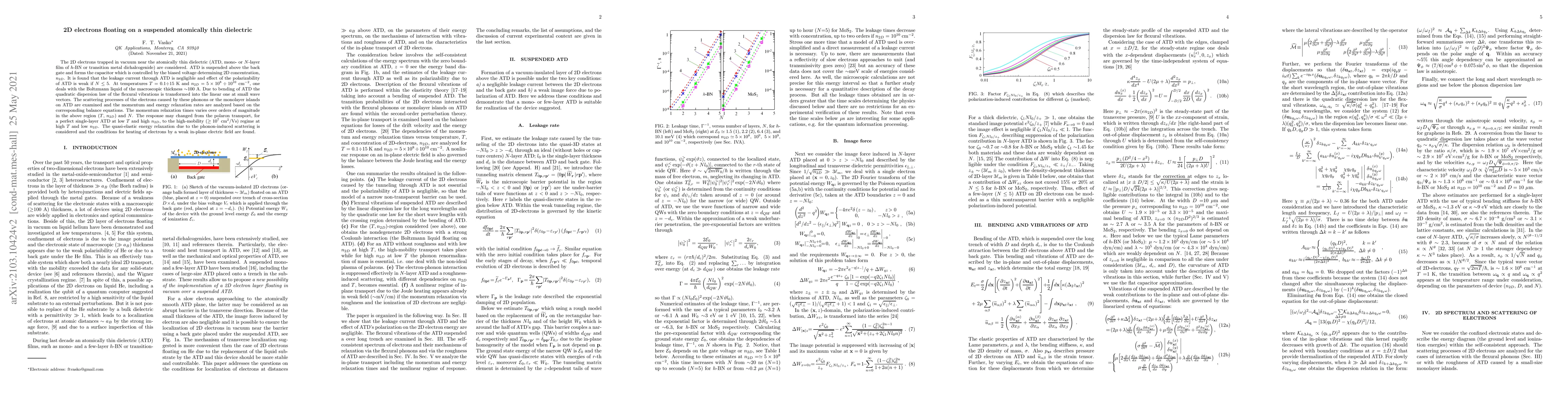 The research investigates 2D electrons trapped in vacuum near atomically thin dielectrics (like BN or TMDC), finding negligible leakage current and a Boltzmann liquid with macroscopic thickness at low temperatures and high electron densities. The study analyzes electron scattering by flexural phonons and island-like structures, revealing varying momentum relaxation times and diverse transport regimes from polaron to high-mobility. It also explores electron heating by weak in-plane electric fields.