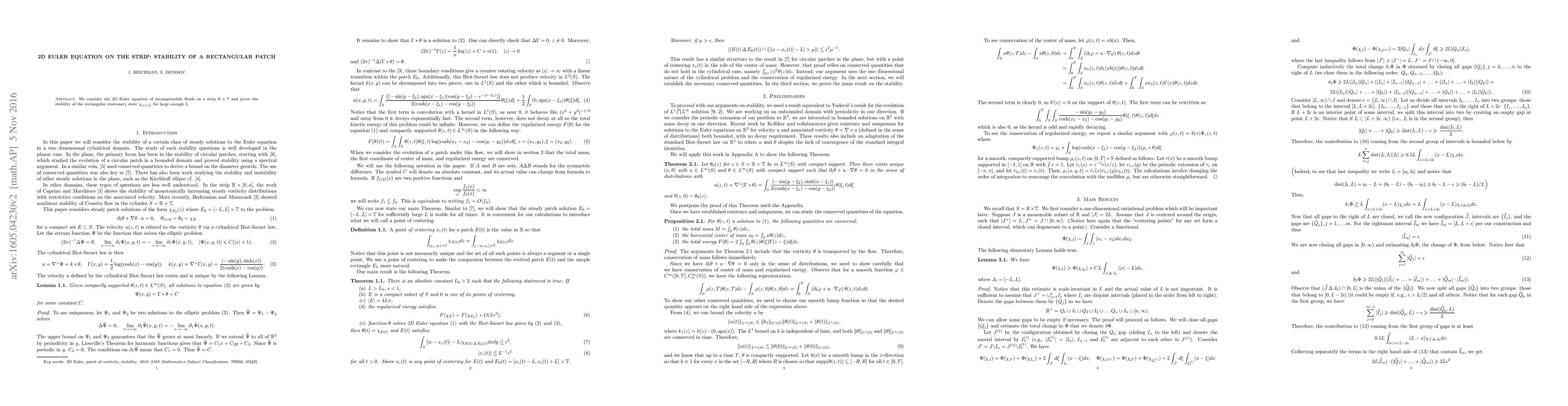 Summary: This paper investigates the stability of a rectangular patch in the 2D Euler equation for incompressible fluids on a strip, proving that the rectangular stationary state is stable under small perturbations.