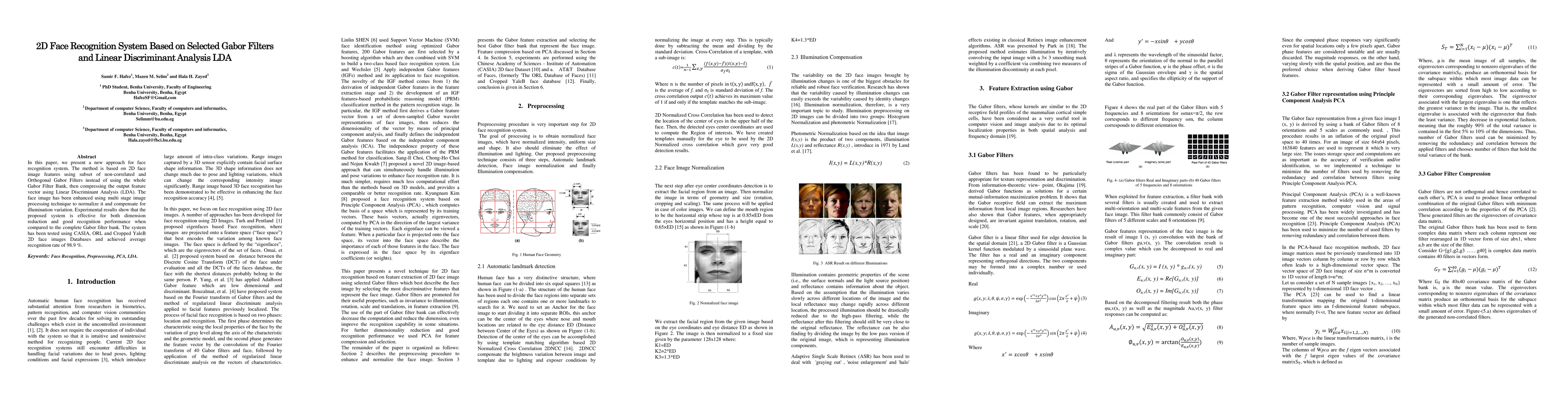 This paper proposes a 2D face recognition system using a subset of orthogonal Gabor filters and Linear Discriminant Analysis (LDA) for feature extraction. The method enhances and normalizes face images to compensate for illumination variations, achieving an average recognition rate of 98.9% across multiple databases.