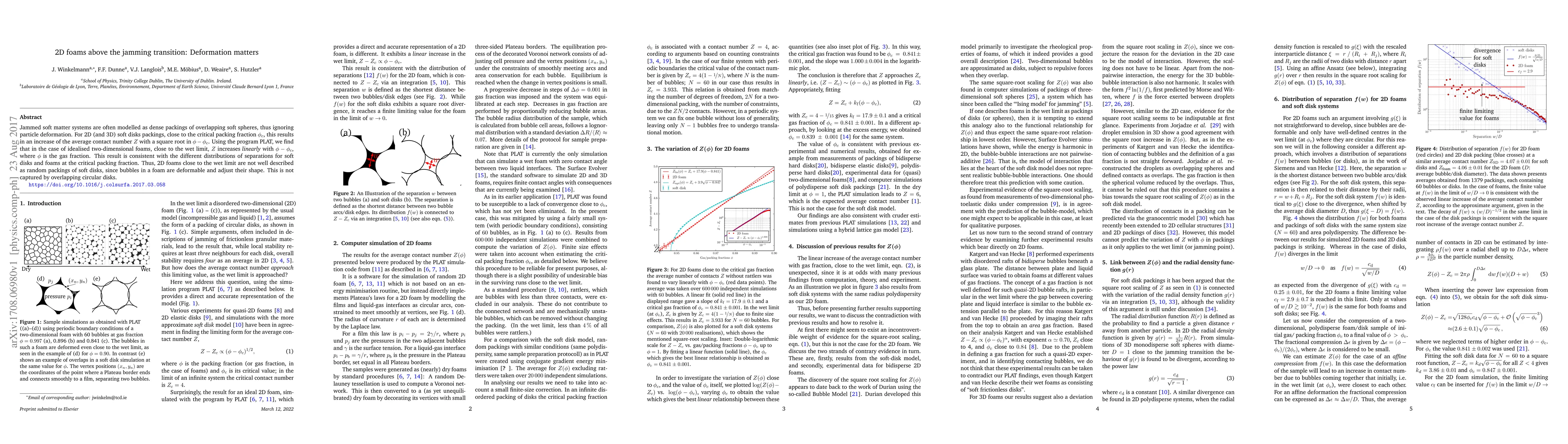 Jammed soft matter systems are often modelled as dense packings of overlapping soft spheres, thus ignoring particle deformation. For 2D (and 3D) soft disks packings, close to the critical packing fraction $\varphi_c$, this results in an increase of the average contact number $Z$ with a square root in $\varphi-\varphi_c$. Using the program PLAT, we find that in the case of idealised two-dimensional foams, close to the wet limit, $Z$ increases linearly with $\varphi-\varphi_c$, where $\varphi$ is the gas fraction. This result is consistent with the different distributions of separations for soft disks and foams at the critical packing fraction. Thus, 2D foams close to the wet limit are not well described as random packings of soft disks, since bubbles in a foam are deformable and adjust their shape. This is not captured by overlapping circular disks.