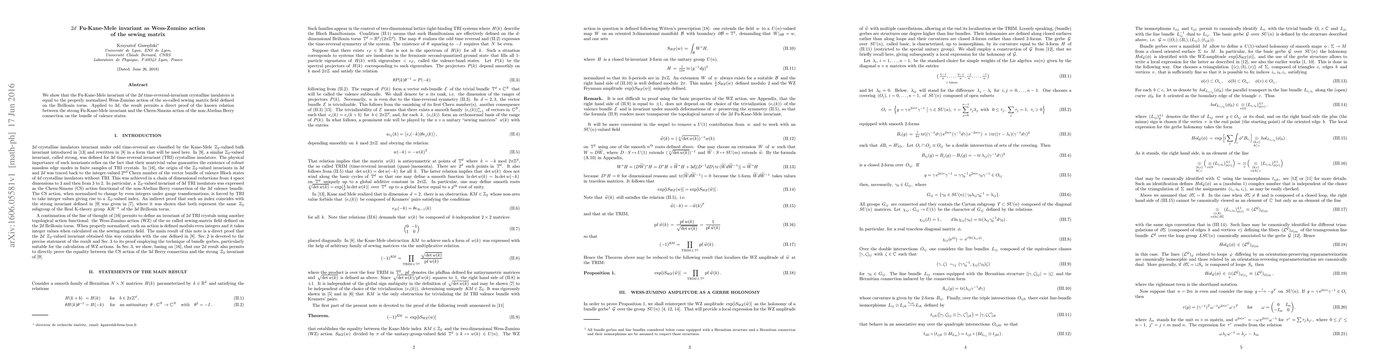 We show that the Fu-Kane-Mele invariant of the 2d time-reversal-invariant crystalline insulators is equal to the properly normalized Wess-Zumino action of the so-called sewing matrix field defined on the Brillouin torus. Applied to 3d, the result permits a direct proof of the known relation between the strong Fu-Kane-Mele invariant and the Chern-Simons action of the non-Abelian Berry connection on the bundle of valence states.
