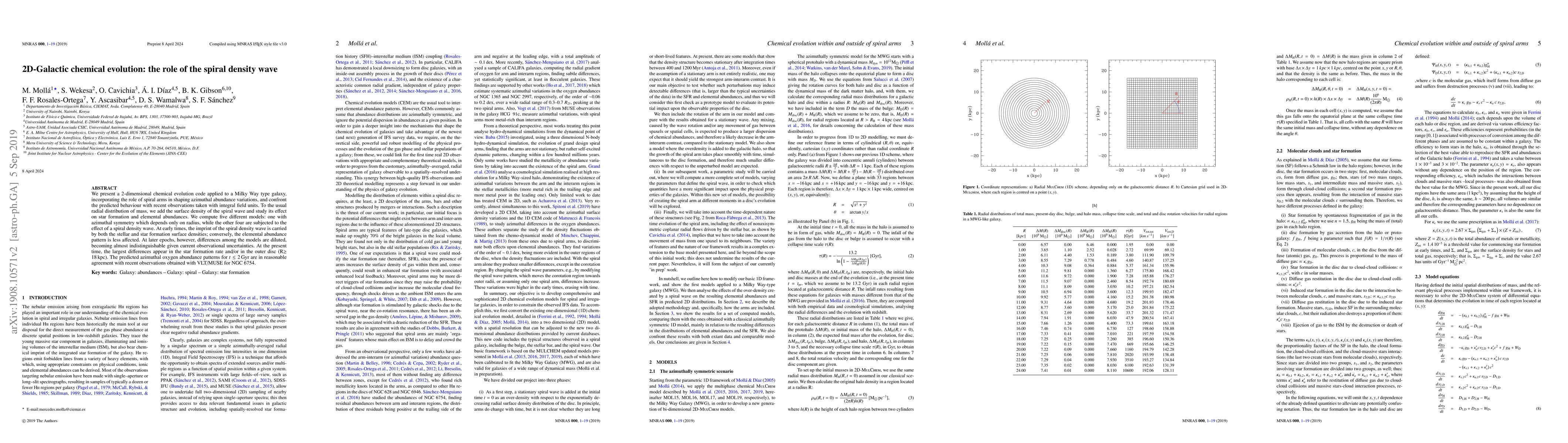 We present a 2-dimensional chemical evolution code applied to a Milky Way type galaxy, incorporating the role of spiral arms in shaping azimuthal abundance variations, and confront the predicted behaviour with recent observations taken with integral field units. To the usual radial distribution of mass, we add the surface density of the spiral wave and study its effect on star formation and elemental abundances. We compute five different models: one with azimuthal symmetry which depends only on radius, while the other four are subjected to the effect of a spiral density wave. At early times, the imprint of the spiral density wave is carried by both the stellar and star formation surface densities; conversely, the elemental abundance pattern is less affected. At later epochs, however, differences among the models are diluted, becoming almost indistinguishable given current observational uncertainties. At the present time, the largest differences appear in the star formation rate and/or in the outer disc (R$\ge$ 18\,kpc). The predicted azimuthal oxygen abundance patterns for $t \le 2$\,Gyr are in reasonable agreement with recent observations obtained with VLT/MUSE for NGC 6754