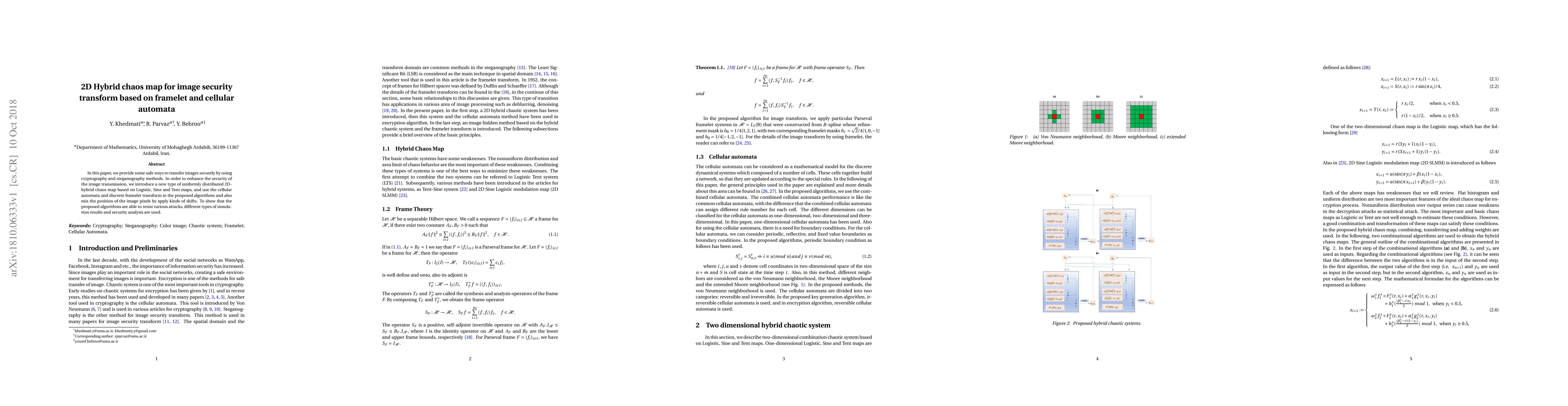 In this paper, we provide some safe ways to transfer images securely by using cryptography and steganography methods. In order to enhance the security of the image transmission, we introduce a new type of uniformly distributed 2D-hybrid chaos map based on Logistic, Sine and Tent maps, and use the cellular automata and discrete framelet transform in the proposed algorithms and also mix the position of the image pixels by apply kinds of shifts. To show that the proposed algorithms are able to resist various attacks, different types of simulation results and security analysis are used.