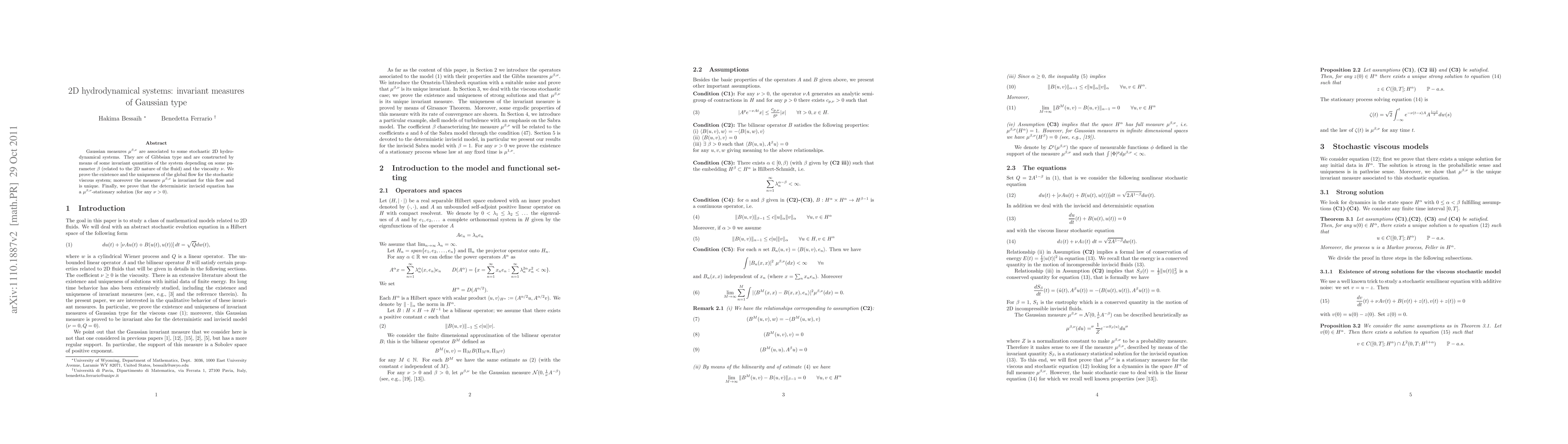 Gaussian measures $\mu^{\beta,\nu}$ are associated to some stochastic 2D hydrodynamical systems. They are of Gibbsian type and are constructed by means of some invariant quantities of the system depending on some parameter $\beta$ (related to the 2D nature of the fluid) and the viscosity $\nu$. We prove the existence and the uniqueness of the global flow for the stochastic viscous system; moreover the measure $\mu^{\beta,\nu}$ is invariant for this flow and is unique. Finally, we prove that the deterministic inviscid equation has a $\mu^{\beta,\nu}$-stationary solution (for any $\nu>0$).