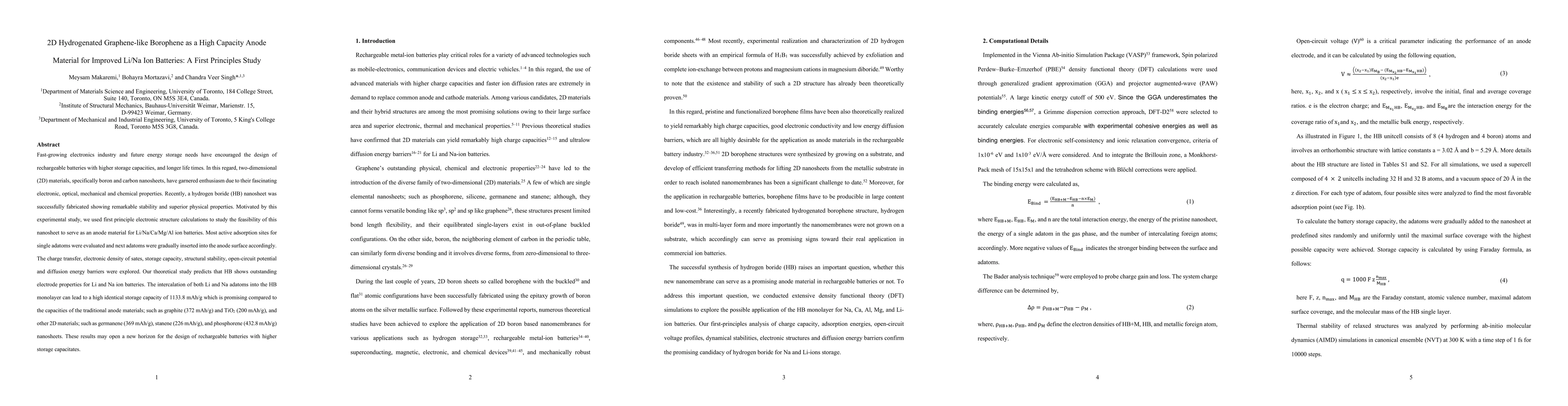 This study investigates the potential of hydrogenated graphene-like borophene as a high-capacity anode material for Li/Na ion batteries using first principles calculations. The theoretical analysis reveals a remarkable storage capacity of 1133.8 mAh/g, significantly surpassing traditional and other 2D anode materials.