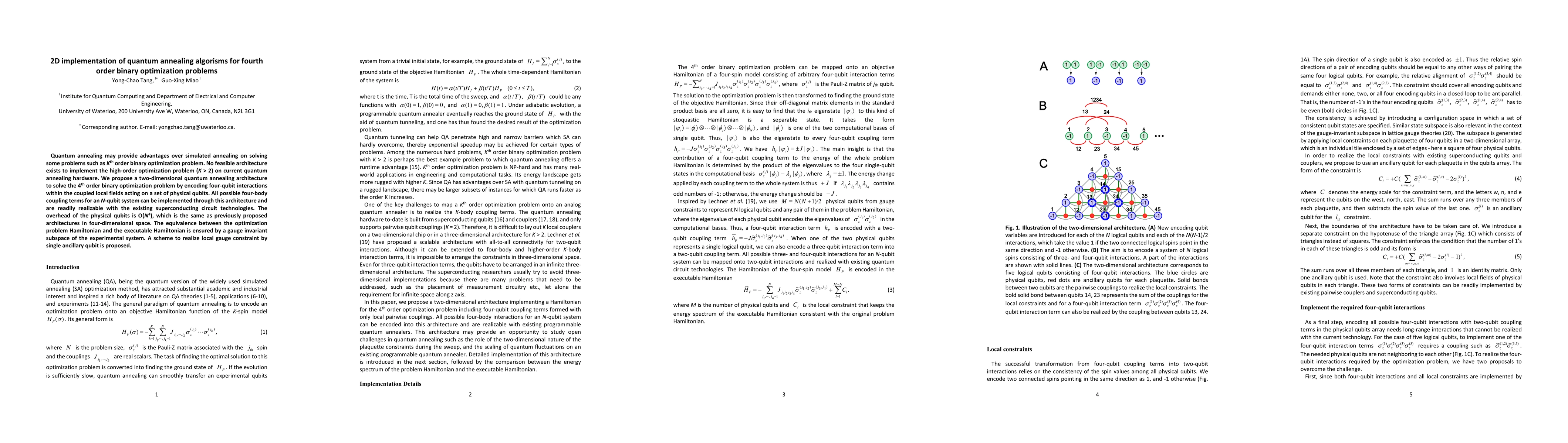 Quantum annealing may provide advantages over simulated annealing on solving some problems such as Kth order binary optimization problem. No feasible architecture exists to implement the high-order optimization problem (K > 2) on current quantum annealing hardware. We propose a two-dimensional quantum annealing architecture to solve the 4th order binary optimization problem by encoding four-qubit interactions within the coupled local fields acting on a set of physical qubits. All possible four-body coupling terms for an N-qubit system can be implemented through this architecture and are readily realizable with the existing superconducting circuit technologies. The overhead of the physical qubits is O(N4), which is the same as previously proposed architectures in four-dimensional space. The equivalence between the optimization problem Hamiltonian and the executable Hamiltonian is ensured by a gauge invariant subspace of the experimental system. A scheme to realize local gauge constraint by single ancillary qubit is proposed.