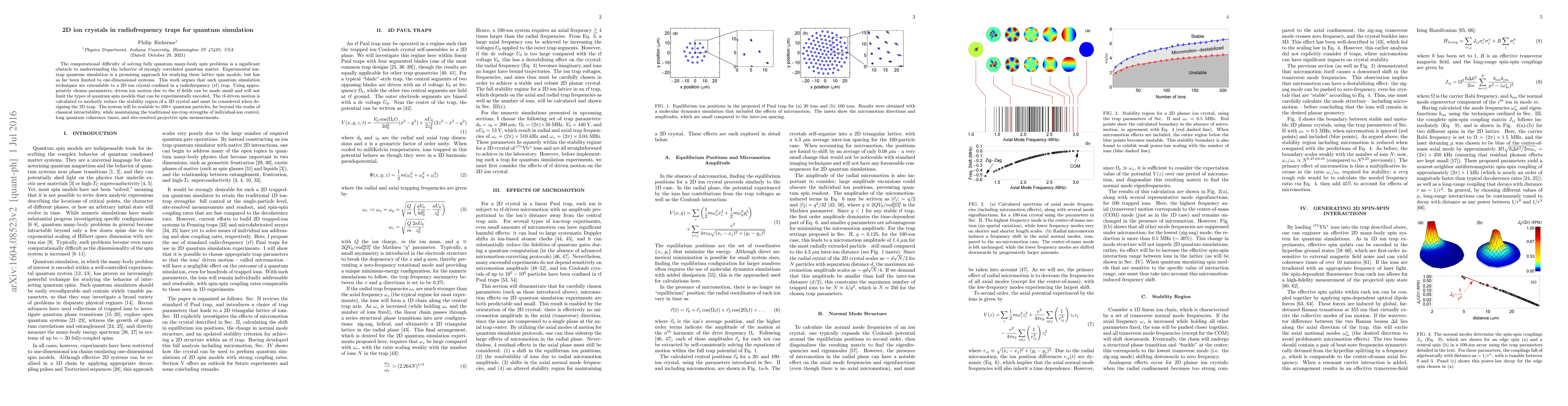 The computational difficulty of solving fully quantum many-body spin problems is a significant obstacle to understanding the behavior of strongly correlated quantum matter. Experimental ion-trap quantum simulation is a promising approach for studying these lattice spin models, but has so far been limited to one-dimensional systems. This work argues that such quantum simulation techniques are extendable to a 2D ion crystal confined in a radiofrequency (rf) trap. Using appropriately chosen parameters, driven ion motion due to the rf fields can be made small and will not limit the types of quantum spin models that can be experimentally encoded. The rf-driven motion is calculated to modestly reduce the stability region of a 2D crystal and must be considered when designing the 2D trap. The system will be scalable to 100+ quantum particles, far beyond the realm of classical intractability, while maintaining the traditional ion-trap strengths of individual-ion control, long quantum coherence times, and site-resolved projective spin measurements.