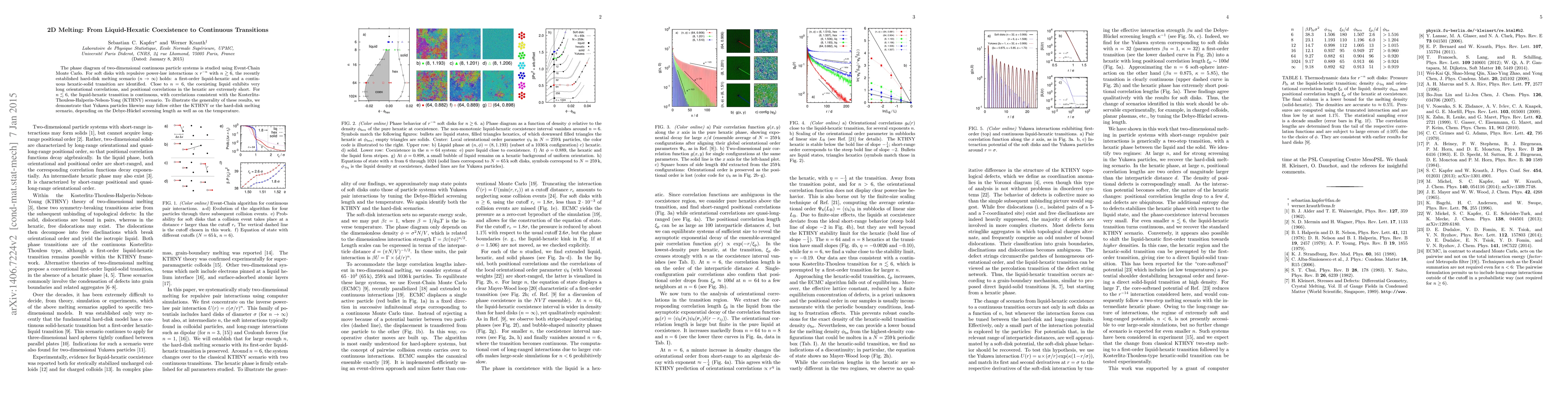 This paper investigates the phase diagram of two-dimensional particle systems using Event-Chain Monte Carlo, identifying first-order and continuous transitions in soft disks with varying repulsive interactions. For interactions with $n \gtrsim 6$, it confirms the hard-disk melting scenario, while for $n \lesssim 6$, it aligns with the Kosterlitz-Thouless theory.