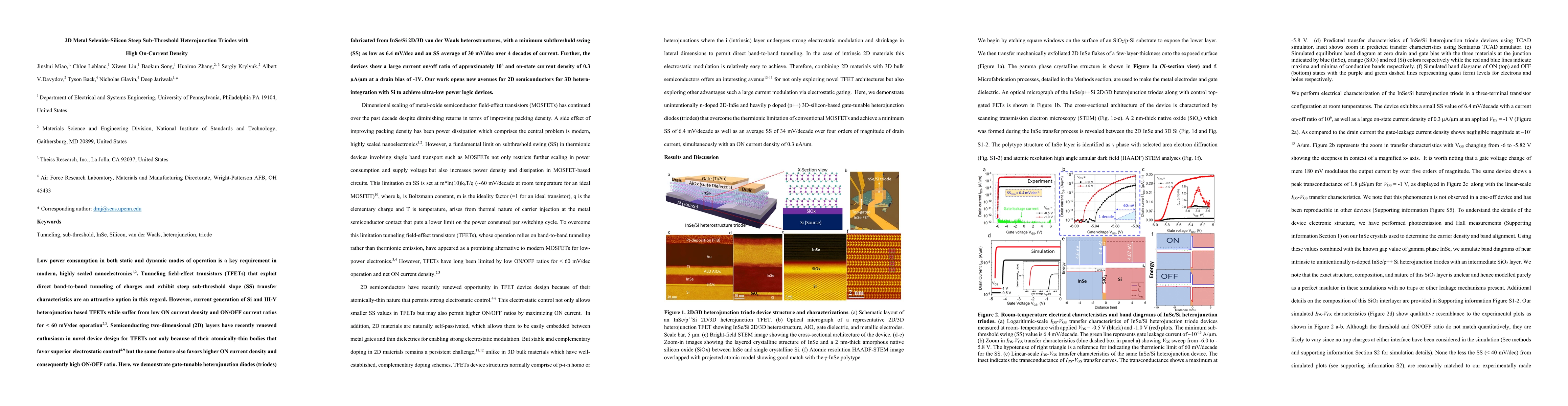This paper presents 2D metal selenide-silicon heterojunction triodes that achieve low subthreshold swing and high on-current density, demonstrating potential for ultra-low power nanoelectronics. The InSe/Si heterostructures exhibit a minimum subthreshold swing of 6.4 mV/dec and an on-state current density of 0.3 uA/um, suggesting promising integration with Si for future low-power devices.
