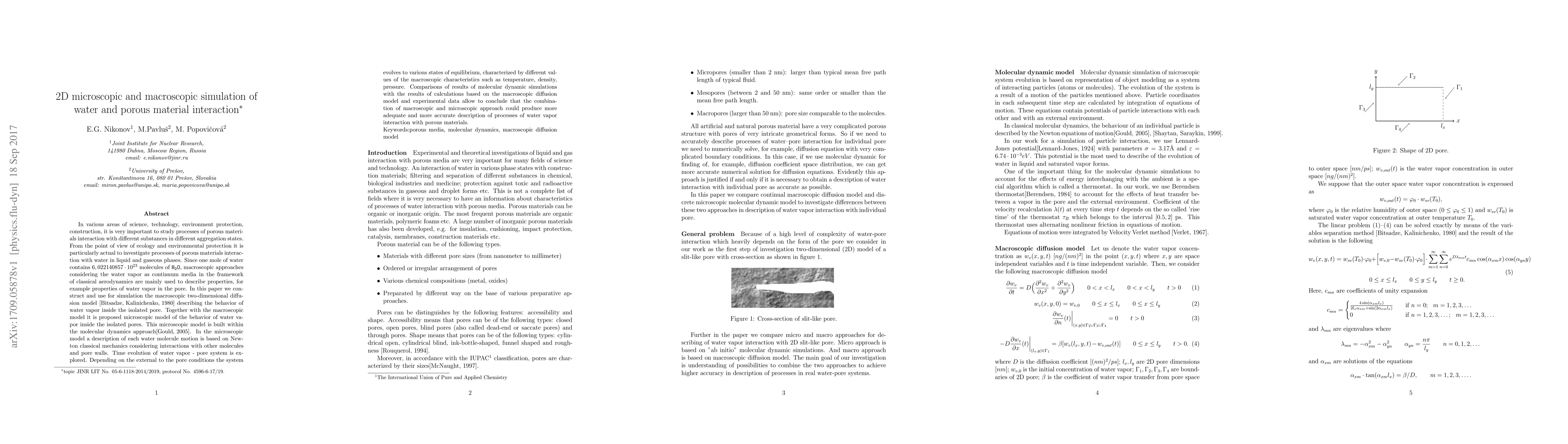 This paper presents both macroscopic and microscopic models to simulate the interaction of water vapor with porous materials. The macroscopic model uses a two-dimensional diffusion approach, while the microscopic model employs molecular dynamics to detail individual water molecule interactions. The study finds that combining these approaches provides a more accurate description of water vapor behavior within porous materials.