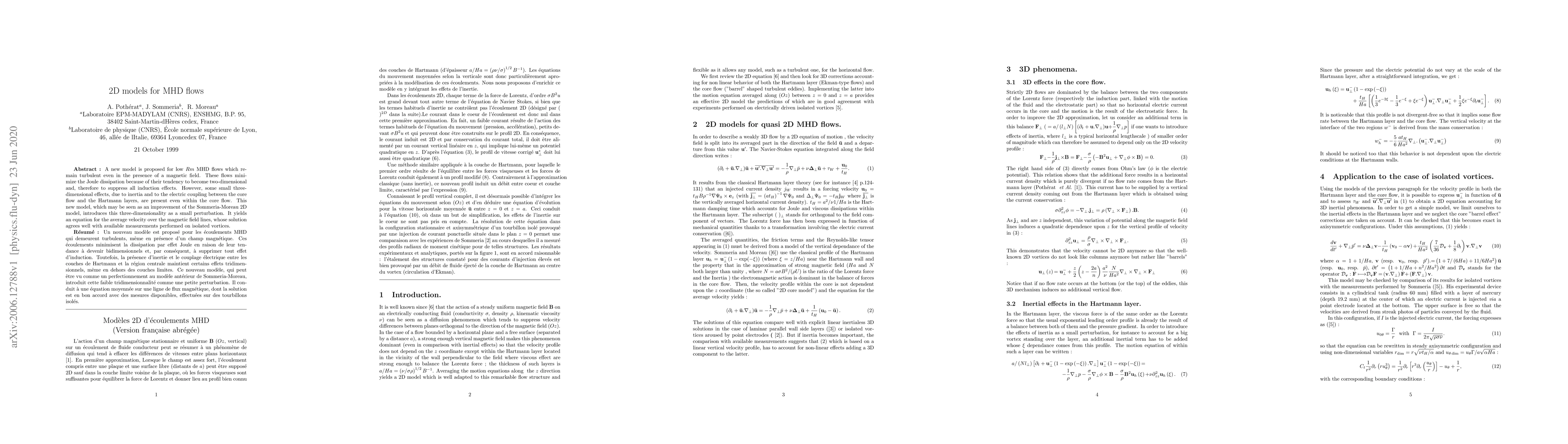 A new model is proposed for low $Rm$ MHD flows which remain turbulent even in the presence of a magnetic field. These flows minimize the Joule dissipation because of their tendency to become two-dimensional and, therefore to suppress all induction effects. However, some small three-dimensional effects, due to inertia and to the electric coupling between the core flow and the Hartmann layers, are present even within the core flow. This new model, which may be seen as an improvement of the Sommeria-Moreau 2D model, introduces this three-dimensionality as a small perturbation. It yields an equation for the average velocity over the magnetic field lines, whose solution agrees well with available measurements performed on isolated vortices.