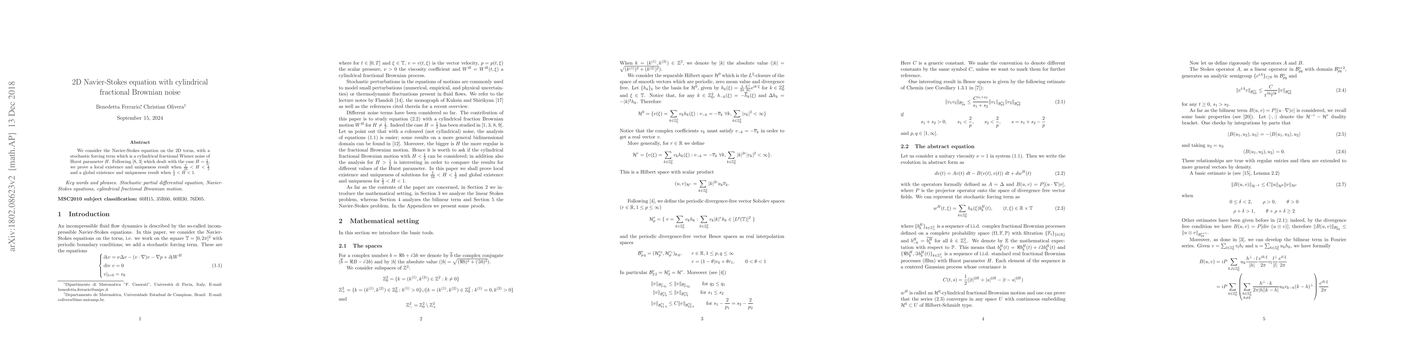 This paper investigates the 2D Navier-Stokes equation on a torus with a stochastic forcing term modeled by a cylindrical fractional Wiener noise. It proves local existence and uniqueness for Hurst parameters $7/16 < H < 1/2$ and global existence and uniqueness for $1/2 < H < 1$.