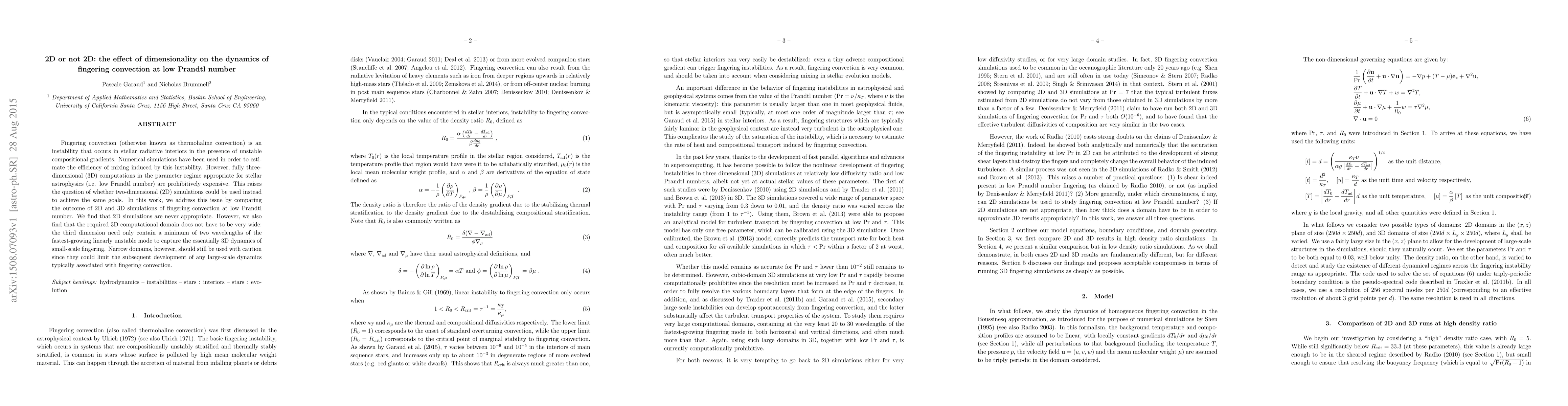 This study compares the dynamics of fingering convection in 2D and 3D simulations at low Prandtl number, finding that 2D simulations are inadequate. It concludes that a 3D domain with a minimum of two wavelengths suffices for capturing small-scale fingering dynamics, but caution is advised for narrow domains due to potential limitations on large-scale dynamics.
