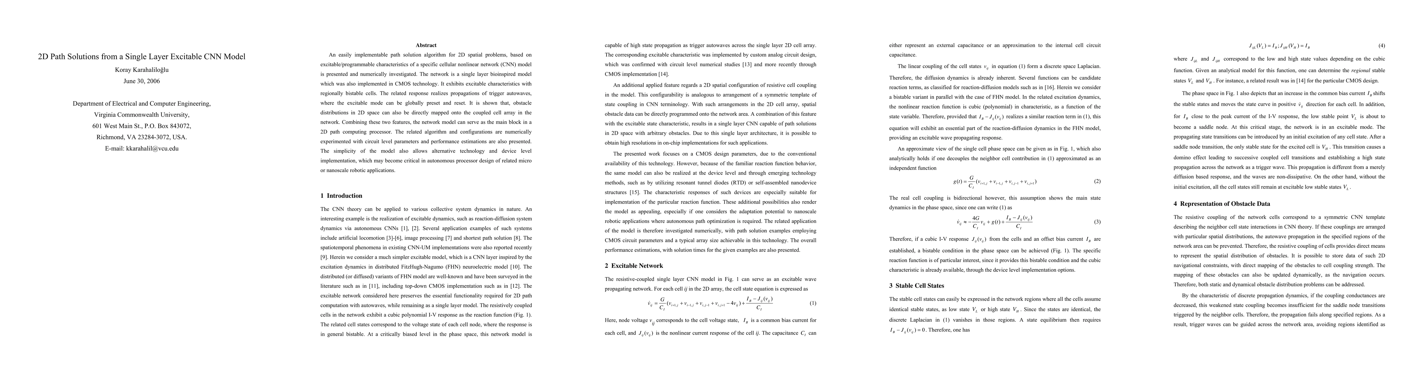 An easily implementable path solution algorithm for 2D spatial problems, based on excitable/programmable characteristics of a specific cellular nonlinear network (CNN) model is presented and numerically investigated. The network is a single layer bioinspired model which was also implemented in CMOS technology. It exhibits excitable characteristics with regionally bistable cells. The related response realizes propagations of trigger autowaves, where the excitable mode can be globally preset and reset. It is shown that, obstacle distributions in 2D space can also be directly mapped onto the coupled cell array in the network. Combining these two features, the network model can serve as the main block in a 2D path computing processor. The related algorithm and configurations are numerically experimented with circuit level parameters and performance estimations are also presented. The simplicity of the model also allows alternative technology and device level implementation, which may become critical in autonomous processor design of related micro or nanoscale robotic applications.