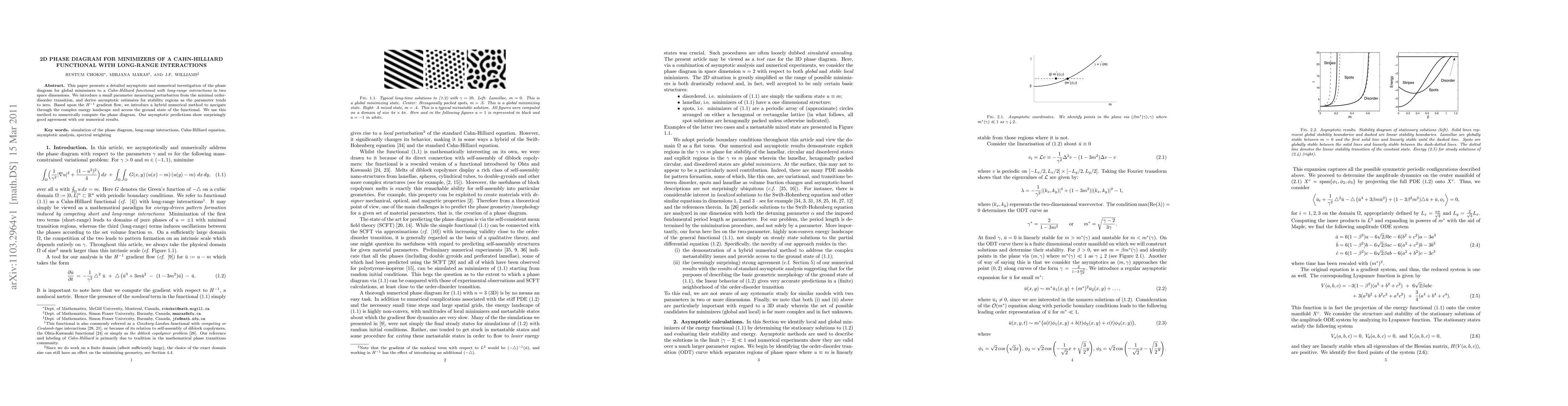 This paper investigates the phase diagram for minimizers of a Cahn-Hilliard functional with long-range interactions in 2D, deriving asymptotic stability estimates and employing a hybrid numerical method to compute the phase diagram, which aligns well with theoretical predictions.
