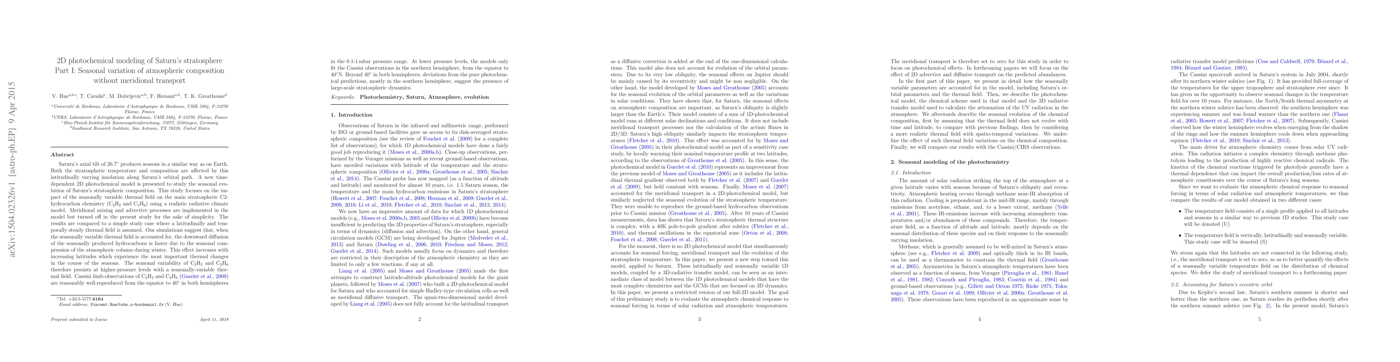 This paper presents a 2D photochemical model to study Saturn's stratospheric composition variations due to seasonal changes without considering meridional transport. The model shows that seasonal thermal variations accelerate the diffusion of hydrocarbons like C2H2 and C2H6, especially at higher latitudes, and reasonably reproduces observed seasonal trends in hydrocarbon concentrations.