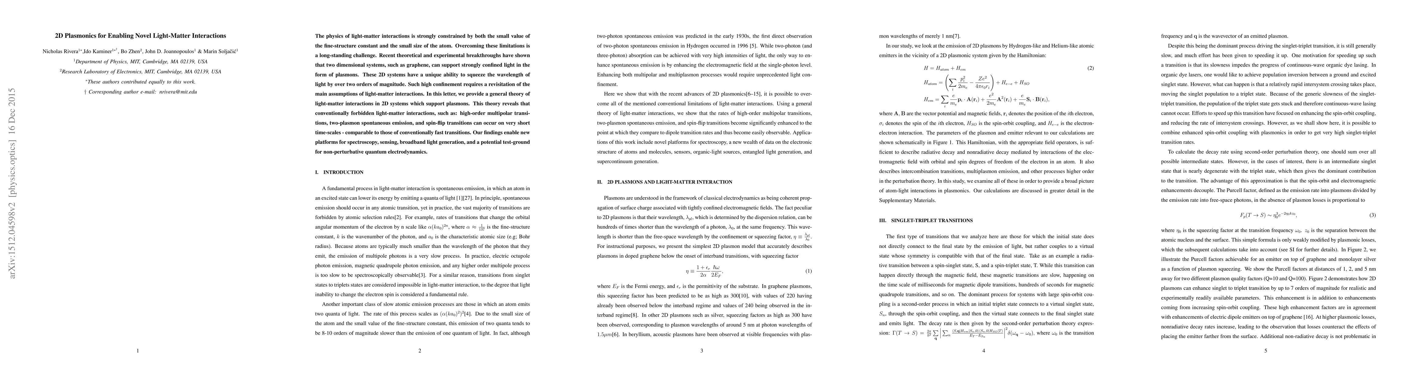 The physics of light-matter interactions is strongly constrained by both the small value of the fine-structure constant and the small size of the atom. Overcoming these limitations is a long-standing challenge. Recent theoretical and experimental breakthroughs have shown that two dimensional systems, such as graphene, can support strongly confined light in the form of plasmons. These 2D systems have a unique ability to squeeze the wavelength of light by over two orders of magnitude. Such high confinement requires a revisitation of the main assumptions of light-matter interactions. In this letter, we provide a general theory of light-matter interactions in 2D systems which support plasmons. This theory reveals that conventionally forbidden light-matter interactions, such as: high-order multipolar transitions, two-plasmon spontaneous emission, and spin-flip transitions can occur on very short time-scales - comparable to those of conventionally fast transitions. Our findings enable new platforms for spectroscopy, sensing, broadband light generation, and a potential test-ground for non-perturbative quantum electrodynamics.