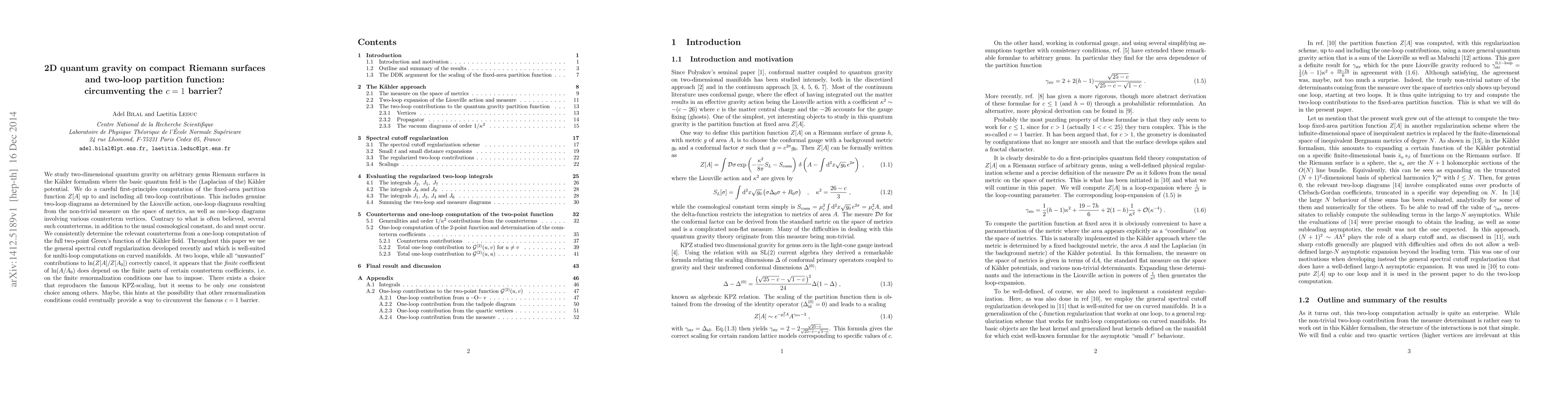 We study two-dimensional quantum gravity on arbitrary genus Riemann surfaces in the Kaehler formalism where the basic quantum field is the (Laplacian of the) Kaehler potential. We do a careful first-principles computation of the fixed-area partition function $Z[A]$ up to and including all two-loop contributions. This includes genuine two-loop diagrams as determined by the Liouville action, one-loop diagrams resulting from the non-trivial measure on the space of metrics, as well as one-loop diagrams involving various counterterm vertices. Contrary to what is often believed, several such counterterms, in addition to the usual cosmological constant, do and must occur. We consistently determine the relevant counterterms from a one-loop computation of the full two-point Green's function of the Kaehler field. Throughout this paper we use the general spectral cutoff regularization developed recently and which is well-suited for multi-loop computations on curved manifolds. At two loops, while all "unwanted" contributions to $\ln (Z[A]/Z[A_0])$ correctly cancel, it appears that the finite coefficient of $\ln (A/A_0)$ does depend on the finite parts of certain counterterm coefficients, i.e. on the finite renormalization conditions one has to impose. There exists a choice that reproduces the famous KPZ-scaling, but it seems to be only one consistent choice among others. Maybe, this hints at the possibility that other renormalization conditions could eventually provide a way to circumvent the famous $c=1$ barrier.