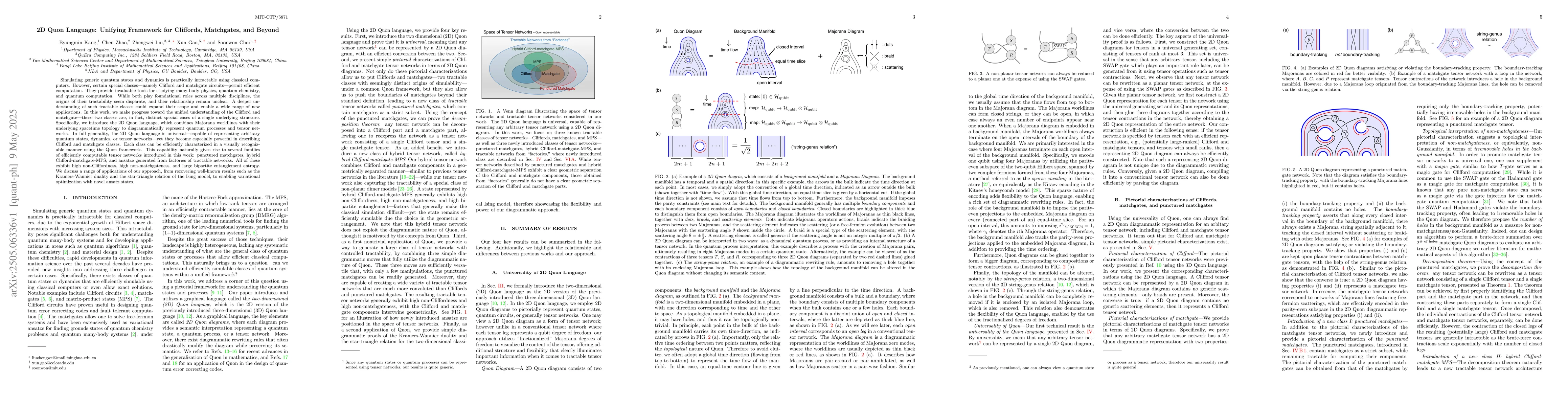 The 2D Quon language, which unifies Clifford and matchgate classes by representing quantum processes and tensor networks using Majorana worldlines and spacetime topology.