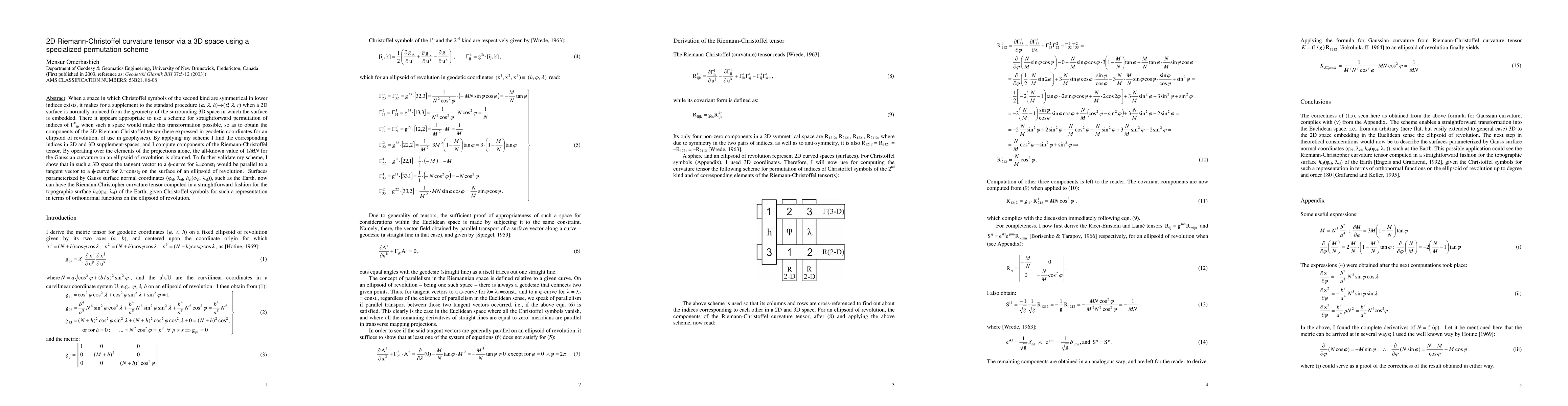 When a space in which Christoffel symbols of the second kind are symmetrical in lower indices exists, it makes for a supplement to the standard procedure when a 2D surface is normally induced from the geometry of the surrounding 3D space in which the surface is embedded. There it appears appropriate to use a scheme for straightforward permutation of indices of Gkij, when such a space would make this transformation possible, so as to obtain the components of the 2D Riemann-Christoffel tensor (here expressed in geodetic coordinates for an ellipsoid of revolution, of use in geophysics). By applying my scheme I find the corresponding indices in 2D and 3D supplement-spaces, and I compute components of the Riemann-Christoffel tensor. By operating over the elements of the projections alone, the all-known value of 1/MN for the Gaussian curvature on an ellipsoid of revolution is obtained. To further validate my scheme, I show that in such a 3D space the tangent vector to a PHI-curve for LAM=const1 would be parallel to a tangent vector to a PHI-curve for LAM=const2 on the surface of an ellipsoid of revolution. Surfaces parameterized by Gauss surface normal coordinates, such as the Earth, now can have the Riemann-Christopher curvature tensor computed in a straightforward fashion for the topographic surface hel(PHIel, LAMel) of the Earth, given Christoffel symbols for such a representation in terms of orthonormal functions on the ellipsoid of revolution.