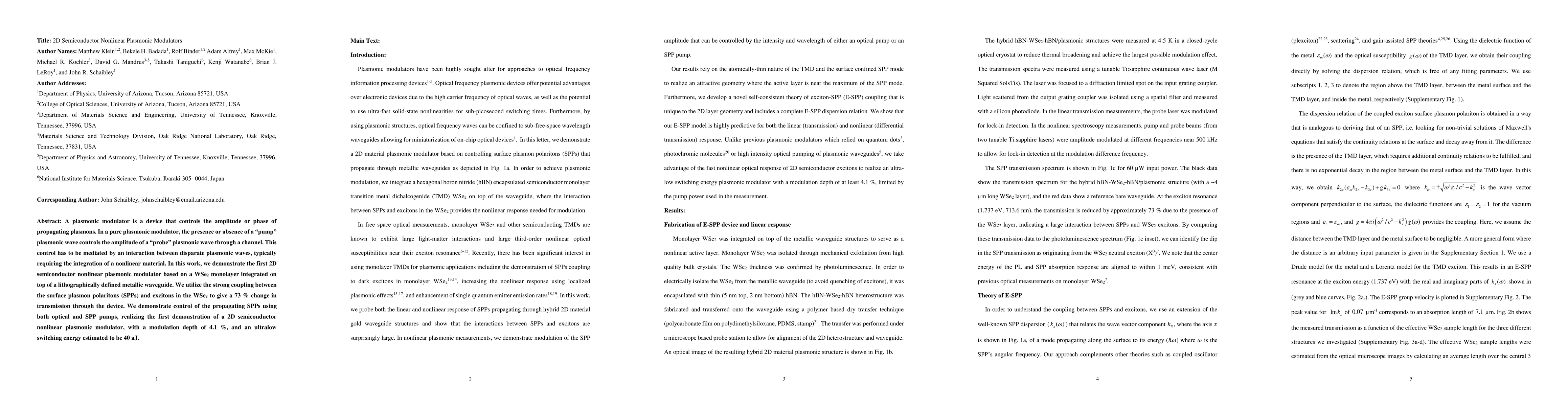 This paper presents the first 2D semiconductor nonlinear plasmonic modulator using a WSe2 monolayer integrated with a metallic waveguide. The device demonstrates a 73 percent change in transmission and a modulation depth of 4.1 percent with ultralow switching energy of 40 aJ.