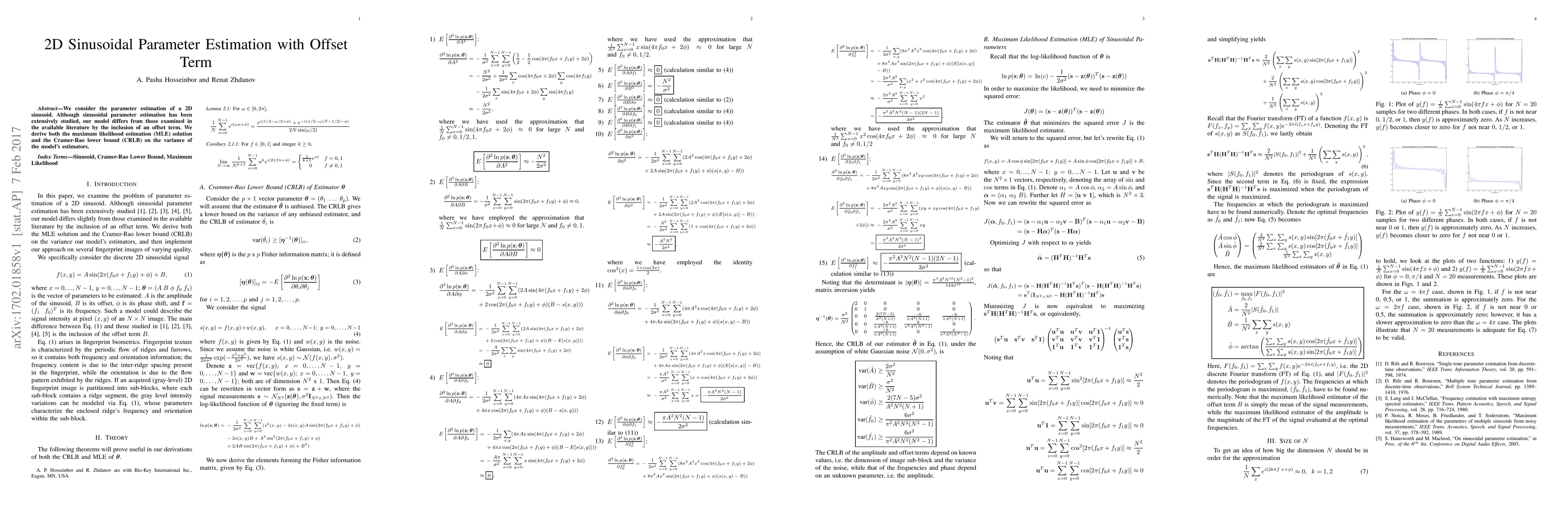 This paper introduces a new approach to estimating 2D sinusoidal parameters with an added offset term, providing both maximum likelihood estimation and Cramer-Rao lower bound results for the model's estimators.