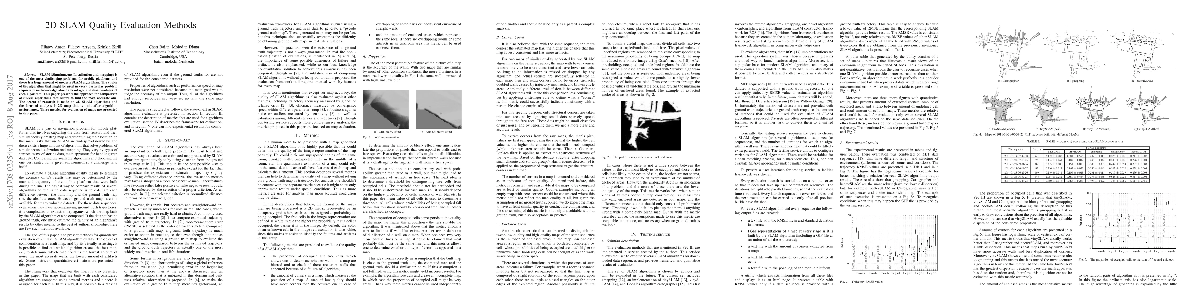 SLAM (Simultaneous Localization and mapping) is one of the most challenging problems for mobile platforms and there is a huge amount of modern SLAM algorithms. The choice of the algorithm that might be used in every particular problem requires prior knowledge about advantages and disadvantages of each algorithm. This paper presents the approach for comparison of SLAM algorithms that allows to find the most accurate one. The accent of research is made on 2D SLAM algorithms and the focus of analysis is 2D map that is built after algorithm performance. Three metrics for evaluation of maps are presented in this paper