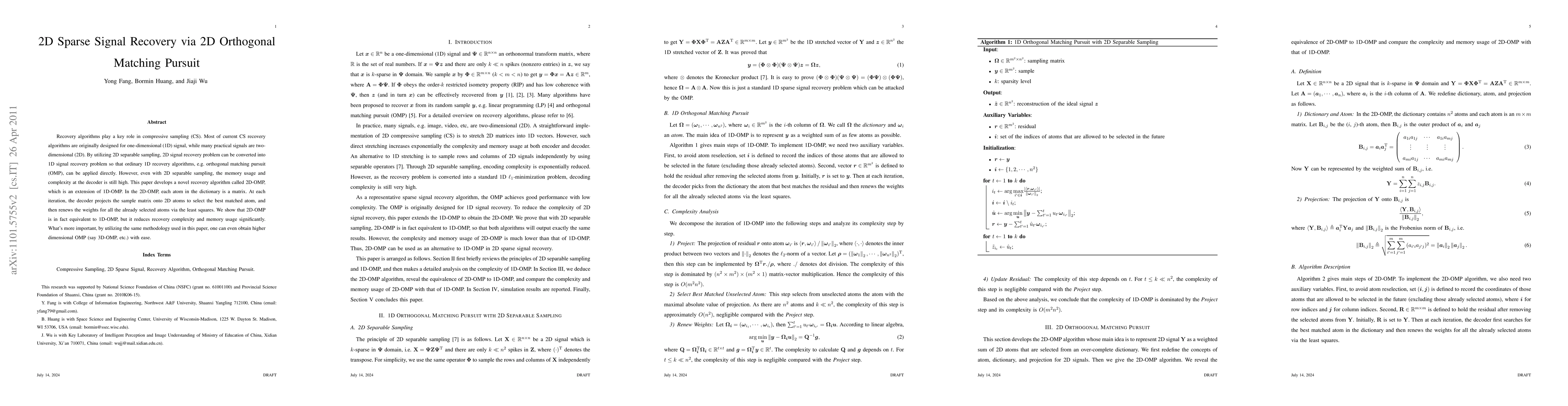 A novel 2D signal recovery algorithm called 2D-OMP is developed to reduce memory usage and complexity in compressive sampling, extending the capabilities of traditional 1D orthogonal matching pursuit.