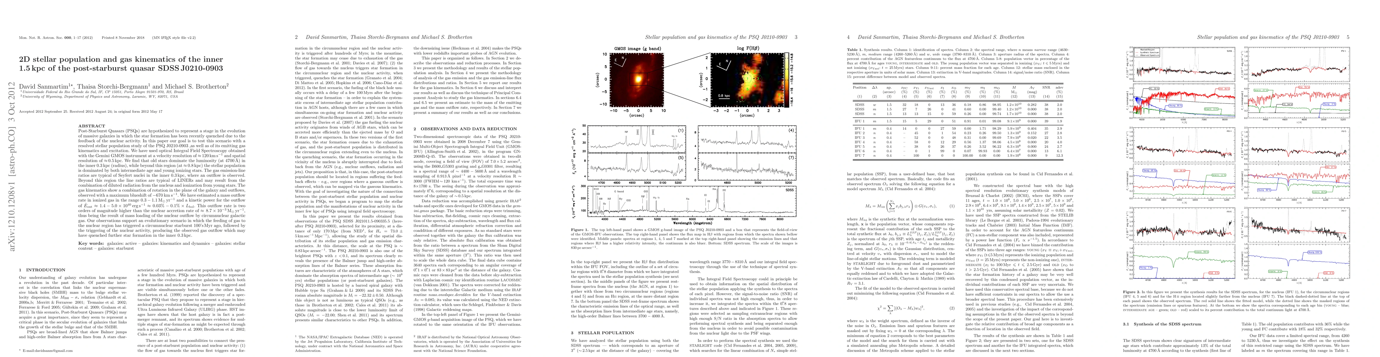 Post-Starburst Quasars (PSQs) are hypothesized to represent a stage in the evolution of massive galaxies in which the star formation has been recently quenched due to the feedback of the nuclear activity. In this paper our goal is to test this scenario with a resolved stellar population study of the PSQ J0210-0903, as well as of its emitting gas kinematics and excitation. We have used optical Integral Field Spectroscopy obtained with the Gemini GMOS instrument at a velocity resolution of ~120 km/s and spatial resolution of ~0.5 kpc. We find that old stars dominate the luminosity (at 4700 \AA) in the inner 0.3 kpc (radius), while beyond this region (at ~0.8 kpc) the stellar population is dominated by both intermediate age and young ionizing stars. The gas emission-line ratios are typical of Seyfert nuclei in the inner 0.3 kpc, where an outflow is observed. Beyond this region the line ratios are typical of LINERs and may result from the combination of diluted radiation from the nucleus and ionization from young stars. The gas kinematics show a combination of rotation in the plane of the galaxy and outflows, observed with a maximum blueshift of -670 km/s. We have estimated a mass outflow rate in ionized gas in the range 0.3--1.1 M_sun/yr and a kinetic power for the outflow of dE/dt ~ 1.4--5.0 x 10^40 erg/s ~0.03% - 0.1% x L_bol. This outflow rate is two orders of magnitude higher than the nuclear accretion rate of ~8.7 x 10^-3 M_sun/yr, thus being the result of mass loading of the nuclear outflow by circumnuclear galactic gas. Our observations support an evolutionary scenario in which the feeding of gas to the nuclear region has triggered a circumnuclear starburst 100's Myr ago, followed by the triggering of the nuclear activity, producing the observed gas outflow which may have quenched further star formation in the inner 0.3 kpc.