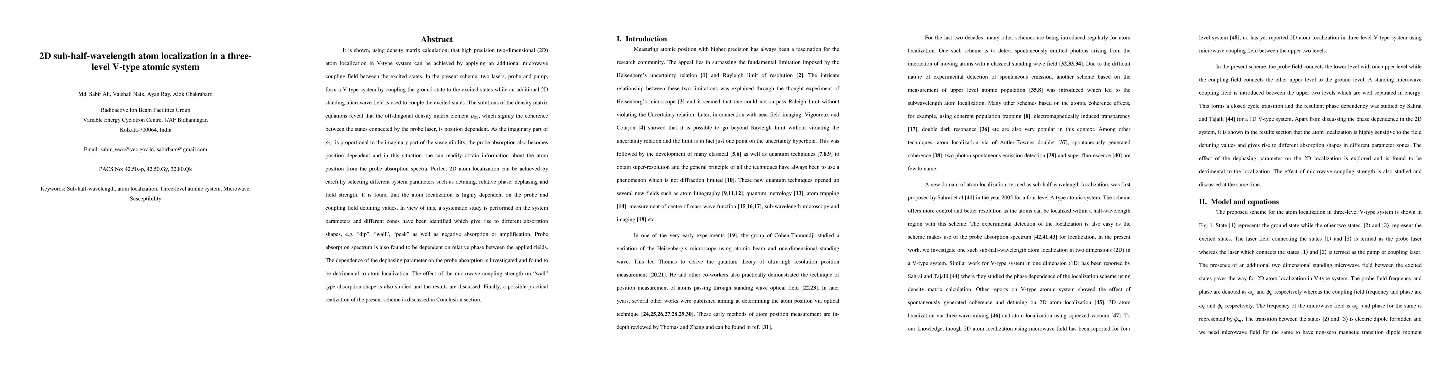 This paper demonstrates high-precision 2D atom localization in a V-type system using density matrix calculations and additional microwave coupling. The probe absorption spectra reveal position-dependent information, enabling perfect localization through careful selection of system parameters.