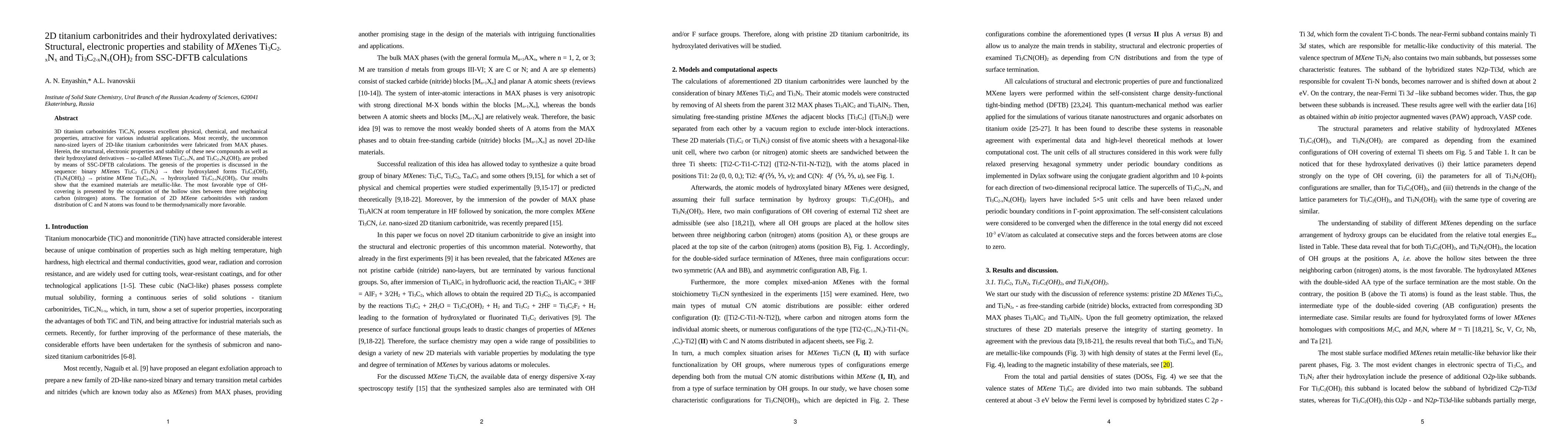 3D titanium carbonitrides TiCxNy possess excellent physical, chemical, and mechanical properties, attractive for various industrial applications. Most recently, the uncommon nano-sized layers of 2D-like titanium carbonitrides were fabricated from MAX phases. Herein, the structural, electronic properties and stability of these new compounds as well as their hydroxylated derivatives - so-called MXenes Ti3C2-xNx and Ti3C2-xNx(OH)2 are probed by means of SSC-DFTB calculations. The genesis of the properties is discussed in the sequence: binary MXenes Ti3C2 (Ti3N2) -> their hydroxylated forms Ti3C2(OH)2 (Ti3N2(OH)2) -> pristine MXene Ti3C2-xNx -> hydroxylated Ti3C2-xNx(OH)2. Our results show that the examined materials are metallic-like. The most favorable type of OH-covering is presented by the occupation of the hollow sites between three neighboring carbon (nitrogen) atoms. The formation of 2D MXene carbonitrides with random distribution of C and N atoms was found to be thermodynamically more favorable.