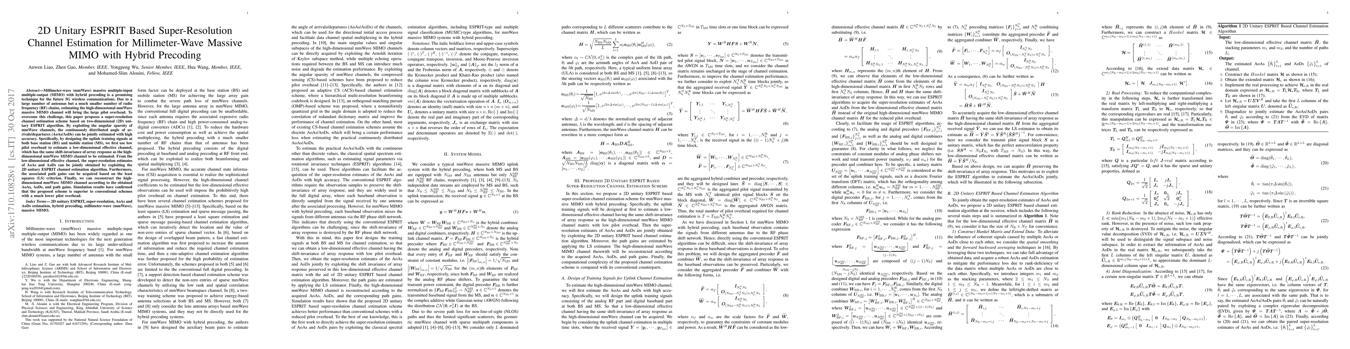 This paper proposes a super-resolution channel estimation method using a 2D unitary ESPRIT algorithm for millimeter-wave massive MIMO with hybrid precoding, aiming to reduce pilot overhead. The method estimates the angular sparsity of mmWave channels to accurately reconstruct high-dimensional channels with lower pilot usage.