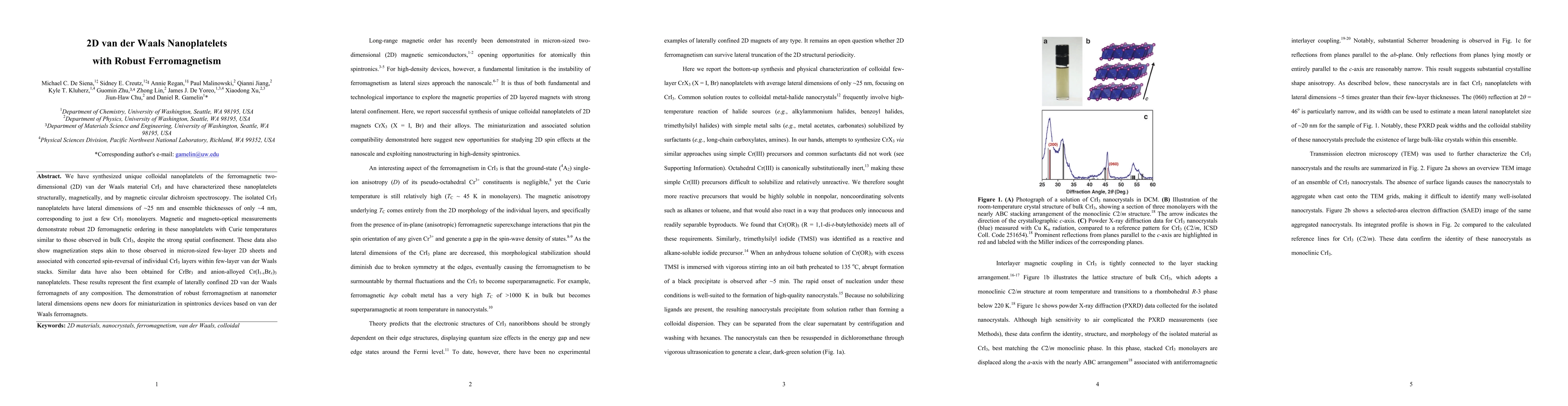 The paper reports the synthesis and characterization of ferromagnetic 2D van der Waals nanoplatelets of CrI3, CrBr3, and their alloys, showing robust ferromagnetism at nanoscale dimensions and potential applications in spintronics. This discovery marks the first of its kind for laterally confined 2D van der Waals ferromagnets.