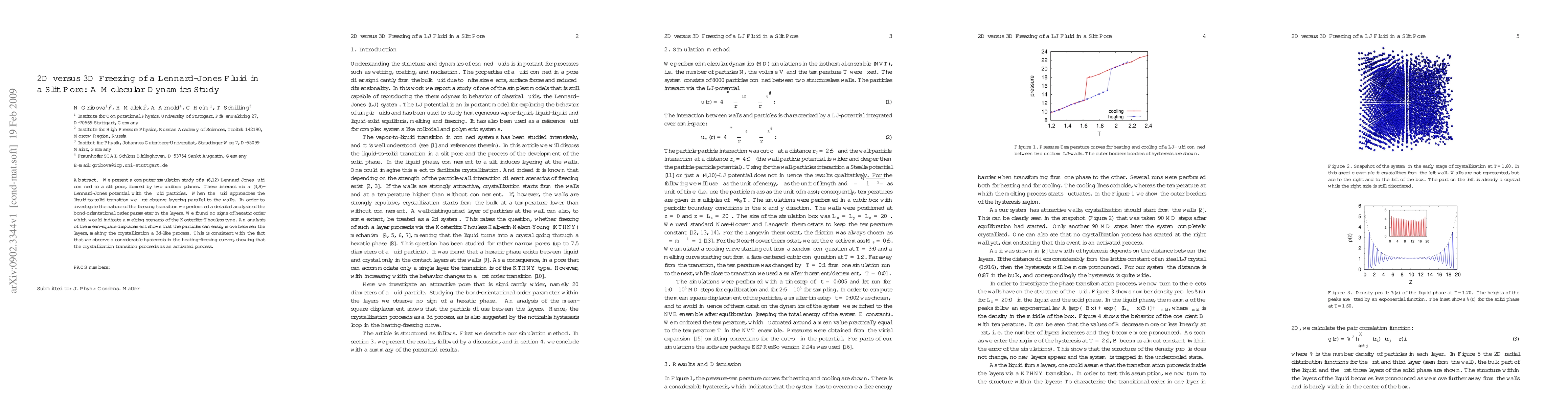 This study uses molecular dynamics simulations to compare 2D and 3D freezing behaviors of a Lennard-Jones fluid in a slit pore, showing that despite initial layering, the freezing process is 3D-like due to particle mobility between layers and significant hysteresis in heating-freezing curves.