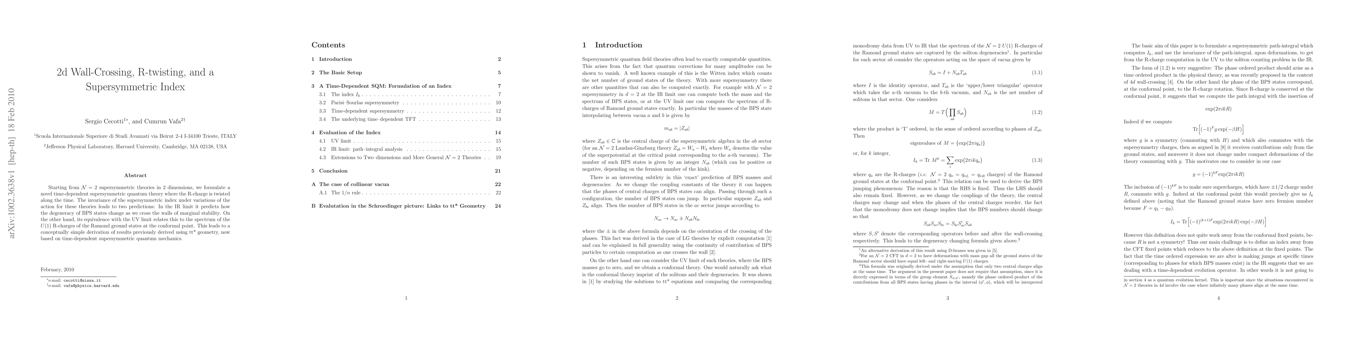 Starting from N=2 supersymmetric theories in 2 dimensions, we formulate a novel time-dependent supersymmetric quantum theory where the R-charge is twisted along the time. The invariance of the supersymmetric index under variations of the action for these theories leads to two predictions: In the IR limit it predicts how the degeneracy of BPS states change as we cross the walls of marginal stability. On the other hand, its equivalence with the UV limit relates this to the spectrum of the U(1) R-charges of the Ramond ground states at the conformal point. This leads to a conceptually simple derivation of results previously derived using tt* geometry, now based on time-dependent supersymmetric quantum mechanics.