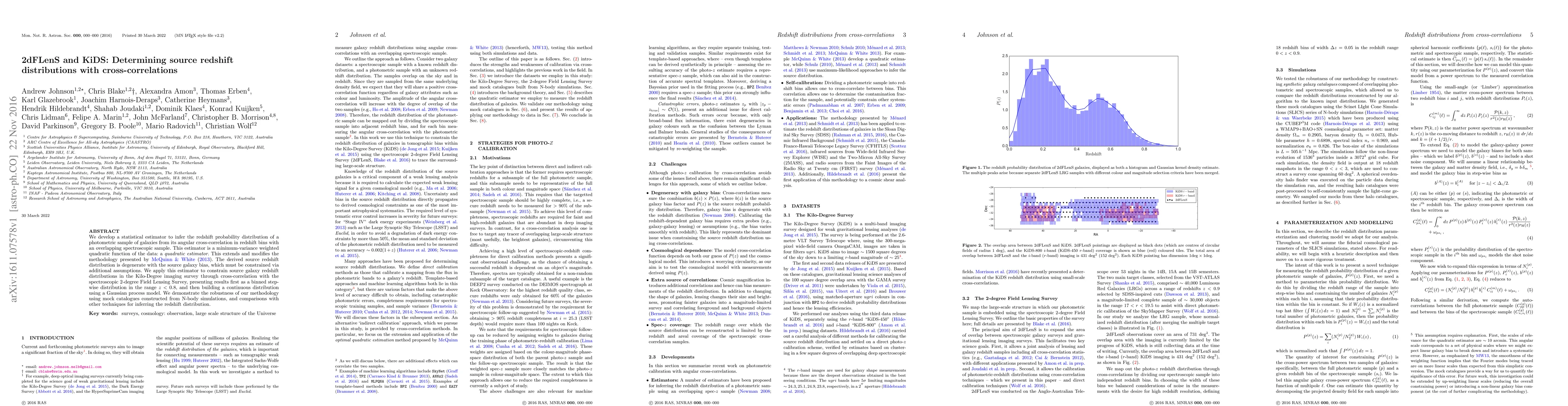 We develop a statistical estimator to infer the redshift probability distribution of a photometric sample of galaxies from its angular cross-correlation in redshift bins with an overlapping spectroscopic sample. This estimator is a minimum variance weighted quadratic function of the data: a quadratic estimator. This extends and modifies the methodology presented by McQuinn & White (2013). The derived source redshift distribution is degenerate with the source galaxy bias, which must be constrained via additional assumptions. We apply this estimator to constrain source galaxy redshift distributions in the Kilo-Degree imaging survey through cross-correlation with the spectroscopic 2-degree Field Lensing Survey, presenting results first as a binned step-wise distribution in the range z < 0.8, and then building a continuous distribution using a Gaussian process model. We demonstrate the robustness of our methodology using mock catalogues constructed from N-body simulations, and comparisons with other techniques for inferring the redshift distribution.