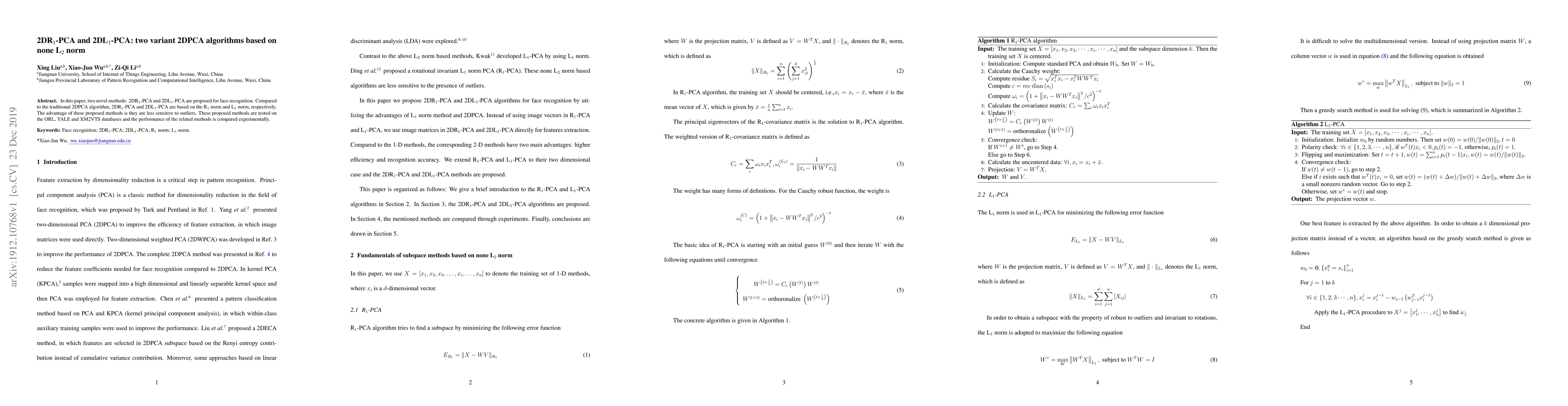 In this paper, two novel methods: 2DR1-PCA and 2DL1-PCA are proposed for face recognition. Compared to the traditional 2DPCA algorithm, 2DR1-PCA and 2DL1-PCA are based on the R1 norm and L1 norm, respectively. The advantage of these proposed methods is they are less sensitive to outliers. These proposed methods are tested on the ORL, YALE and XM2VTS databases and the performance of the related methods is compared experimentally.