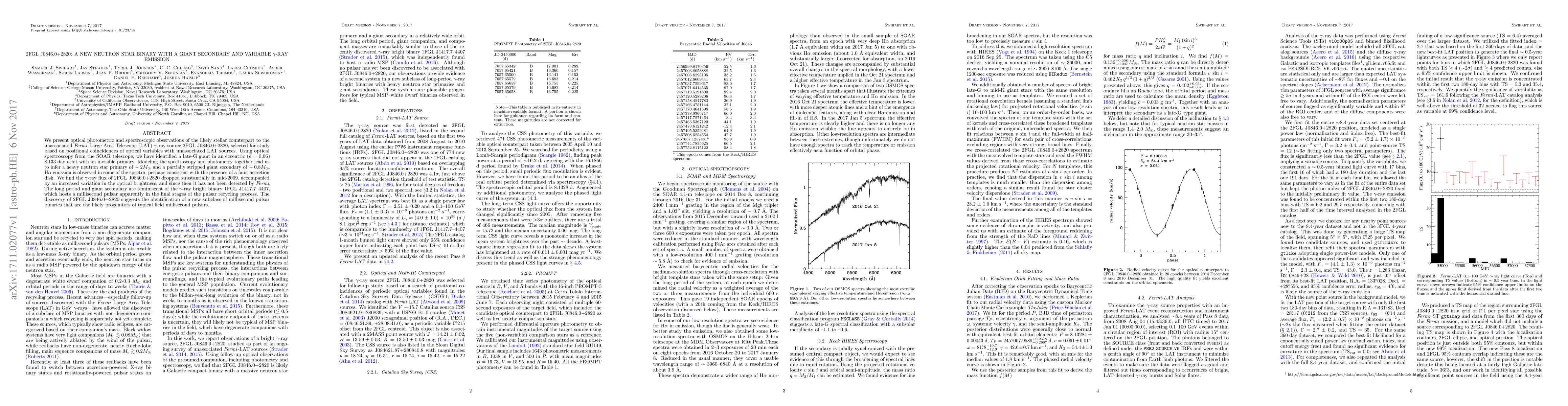 We present optical photometric and spectroscopic observations of the likely stellar counterpart to the unassociated \emph{Fermi}-Large Area Telescope (LAT) $\gamma$-ray source 2FGL J0846.0+2820, selected for study based on positional coincidences of optical variables with unassociated LAT sources. Using optical spectroscopy from the SOAR telescope, we have identified a late-G giant in an eccentric ($e$ = 0.06) 8.133 day orbit with an invisible primary. Modeling the spectroscopy and photometry together lead us to infer a heavy neutron star primary of $\sim 2 M_{\odot}$ and a partially stripped giant secondary of $\sim 0.8 M_{\odot}$. H$\alpha$ emission is observed in some of the spectra, perhaps consistent with the presence of a faint accretion disk. We find the $\gamma$-ray flux of 2FGL J0846.0+2820 dropped substantially in mid-2009, accompanied by an increased variation in the optical brightness, and since then it has not been detected by \emph{Fermi}. The long period and giant secondary are reminiscent of the $\gamma$-ray bright binary 1FGL J1417.7--4407, which hosts a millisecond pulsar apparently in the final stages of the pulsar recycling process. The discovery of 2FGL J0846.0+2820 suggests the identification of a new subclass of millisecond pulsar binaries that are the likely progenitors of typical field millisecond pulsars.