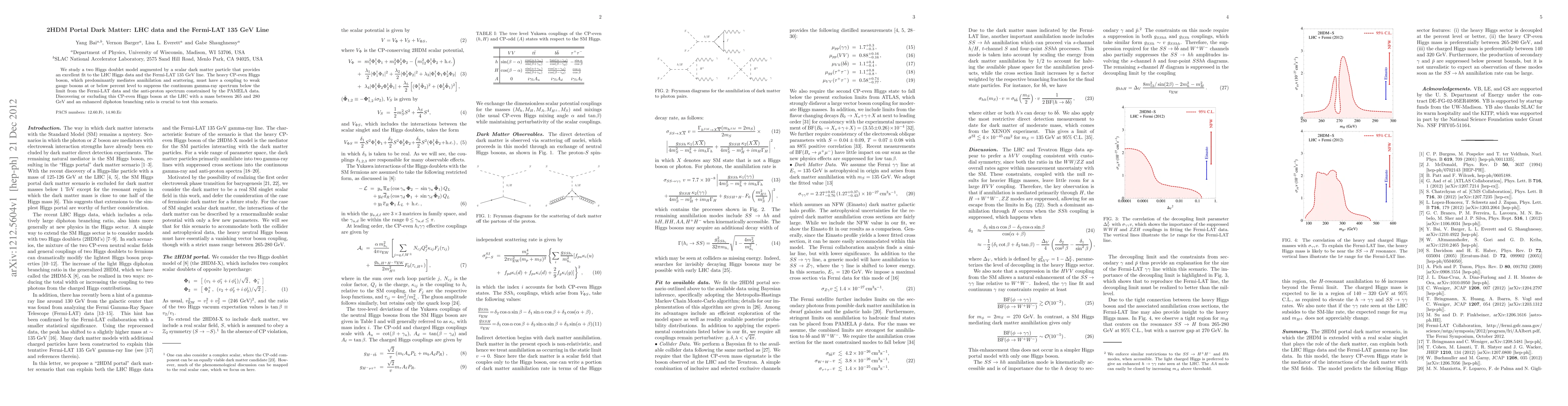 We study a two Higgs doublet model augmented by a scalar dark matter particle that provides an excellent fit to the LHC Higgs data and the Fermi-LAT 135 GeV line. The heavy CP-even Higgs boson, which predominantly mediates annihilation and scattering, must have a coupling to weak gauge bosons at or below percent level to suppress the continuum gamma-ray spectrum below the limit from the Fermi-LAT data and the anti-proton spectrum constrained by the PAMELA data. Discovering or excluding this CP-even Higgs boson at the LHC with a mass between 265 and 280 GeV and an enhanced diphoton branching ratio is crucial to test this scenario.