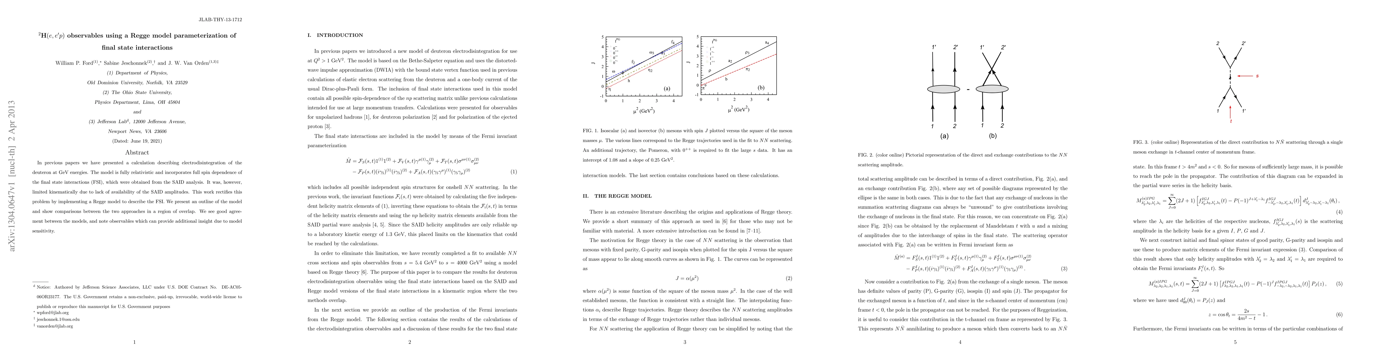 In previous papers we have presented a calculation describing electrodisintegration of the deuteron at GeV energies. The model is fully relativistic and incorporates full spin dependence of the final state interactions (FSI), which were obtained from the SAID analysis. It was, however, limited kinematically due to lack of availability of the SAID amplitudes. This work rectifies this problem by implementing a Regge model to describe the FSI. We present an outline of the model and show comparisons between the two approaches in a region of overlap. We see good agreement between the models, and note observables which can provide additional insight due to model sensitivity.