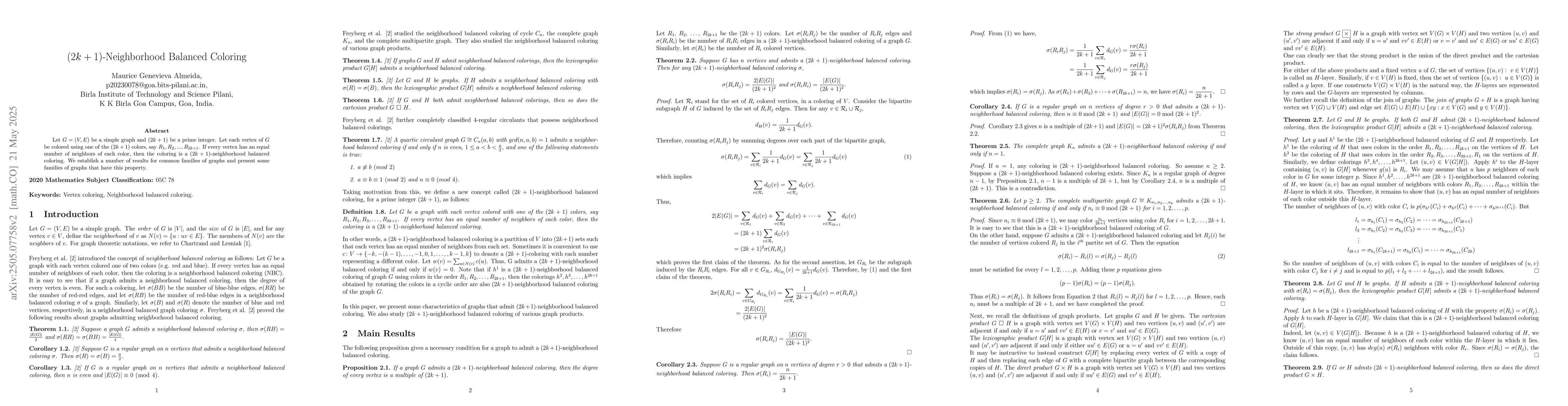 This work introduces and formally defines (2k+1)-neighborhood balanced coloring, distinguishing it by the primality condition of (2k+1) and exploring its occurrence in various graph families.