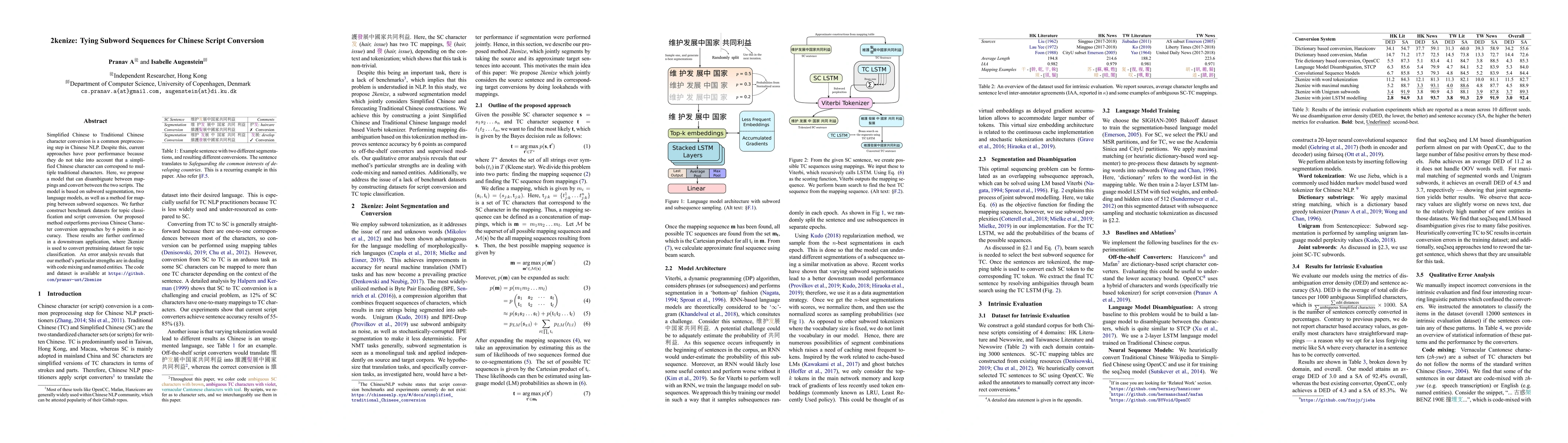 Simplified Chinese to Traditional Chinese character conversion is a common preprocessing step in Chinese NLP. Despite this, current approaches have poor performance because they do not take into account that a simplified Chinese character can correspond to multiple traditional characters. Here, we propose a model that can disambiguate between mappings and convert between the two scripts. The model is based on subword segmentation, two language models, as well as a method for mapping between subword sequences. We further construct benchmark datasets for topic classification and script conversion. Our proposed method outperforms previous Chinese Character conversion approaches by 6 points in accuracy. These results are further confirmed in a downstream application, where 2kenize is used to convert pretraining dataset for topic classification. An error analysis reveals that our method's particular strengths are in dealing with code-mixing and named entities.