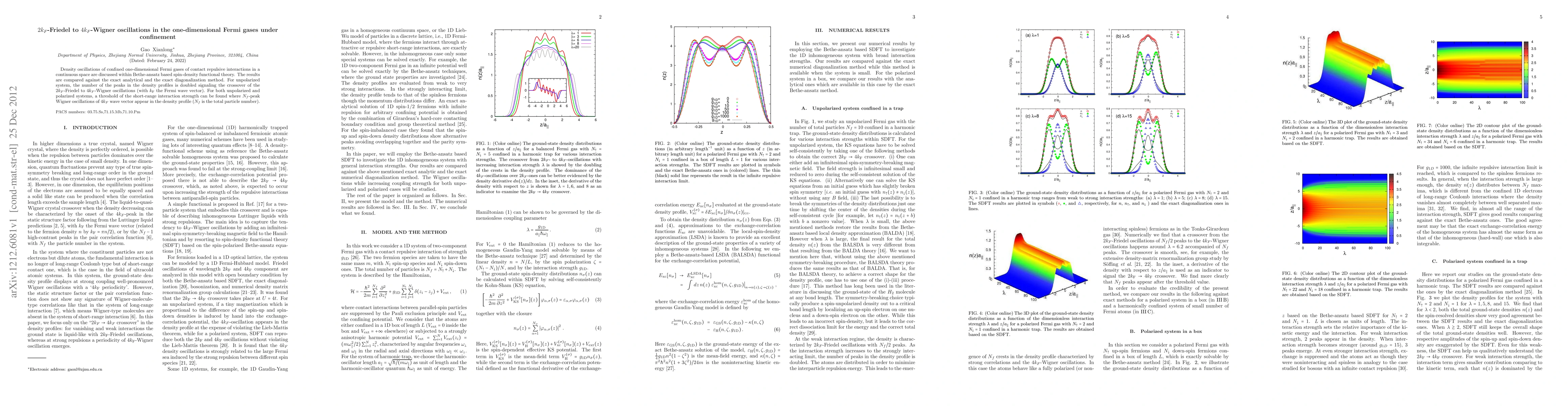 This paper investigates density oscillations in one-dimensional Fermi gases confined in a continuous space, revealing a transition from 2k_F-Friedel to 4k_F-Wigner oscillations using Bethe-ansatz-based spin-density-functional theory. The study finds that the number of peaks in density profiles doubles for unpolarized systems, marking the crossover, and identifies a threshold interaction strength for N_f-peak Wigner oscillations.