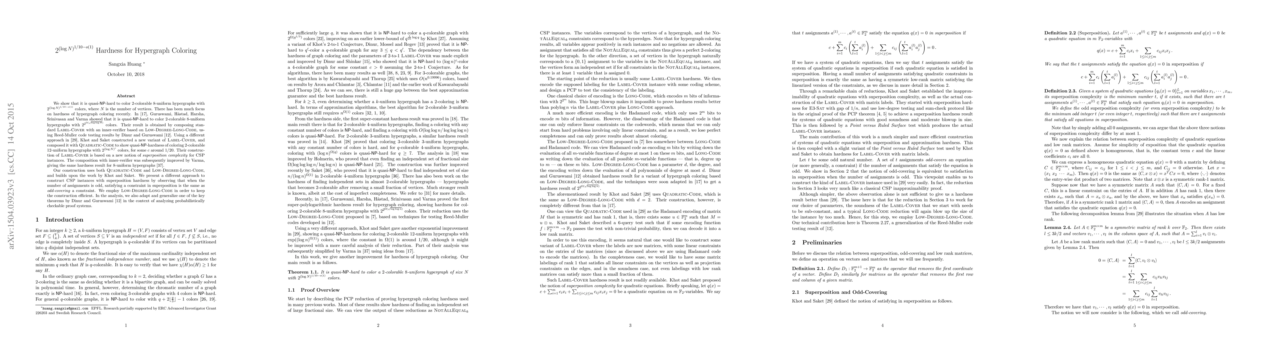This paper demonstrates quasi-NP-hardness for coloring 2-colorable 8-uniform hypergraphs with $2^{(\log N)^{1/10-o(1)}}$ colors, improving upon previous results by using a novel construction combining Quadratic Code and Low Degree Long Code. The approach leverages the concept of "odd-covering" to achieve superposition hardness.