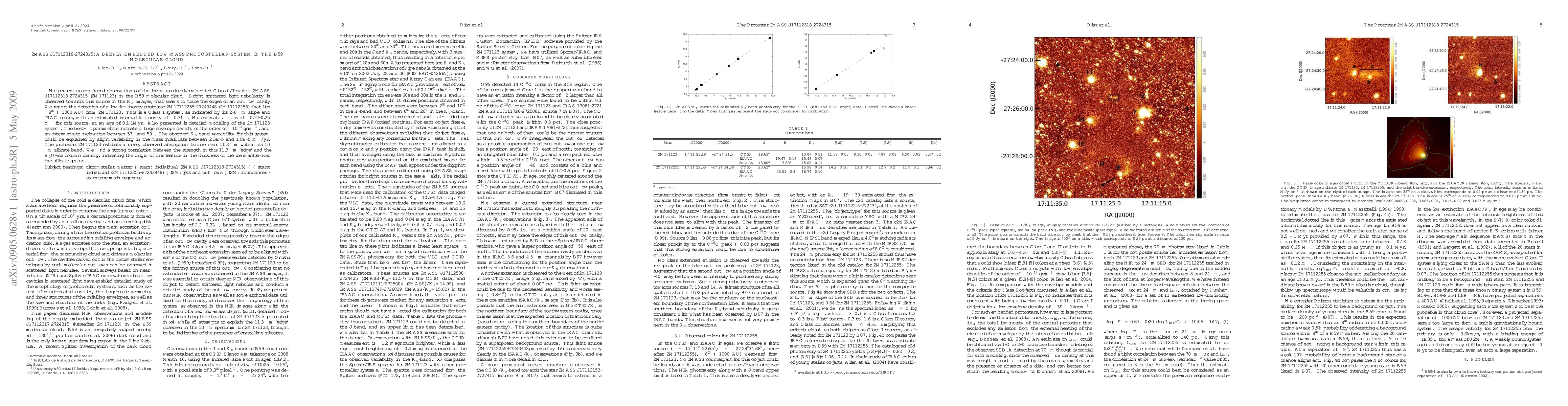 We present near-infrared observations of the low-mass deeply-embedded Class 0/I system 2MASS J17112318-2724315 (2M171123) in the B59 molecular cloud. Bright scattered light nebulosity is observed towards this source in the Ks images, that seems to trace the edges of an outflow cavity. We report the detection of a low-luminosity protostar 2M17112255-27243448 (2M17112255) that lies 8" (~1000 AU) from 2M171123. This is a Class I system, as indicated by its 2-8 micron slope and IRAC colors, with an estimated internal luminosity of ~0.3Lsun. We estimate a mass of ~0.12-0.25 Msun for this source, at an age of 0.1-1Myr. Also presented is detailed modeling of the 2M171123 system. The best-fit parameters indicate a large envelope density of the order of ~10^(-13) g cm^(-3), and an intermediate inclination between 53 and 59deg. The observed Ks-band variability for this system could be explained by slight variability in the mass infall rate between 2.5E-5 and 1.8E-5 Msun/yr. The protostar 2M171123 exhibits a rarely observed absorption feature near 11.3 micron within its 10 micron silicate band. We find a strong correlation between the strength in this 11.3 micron 'edge' and the H2O-ice column density, indicating the origin of this feature in the thickness of the ice mantle over the silicate grains.