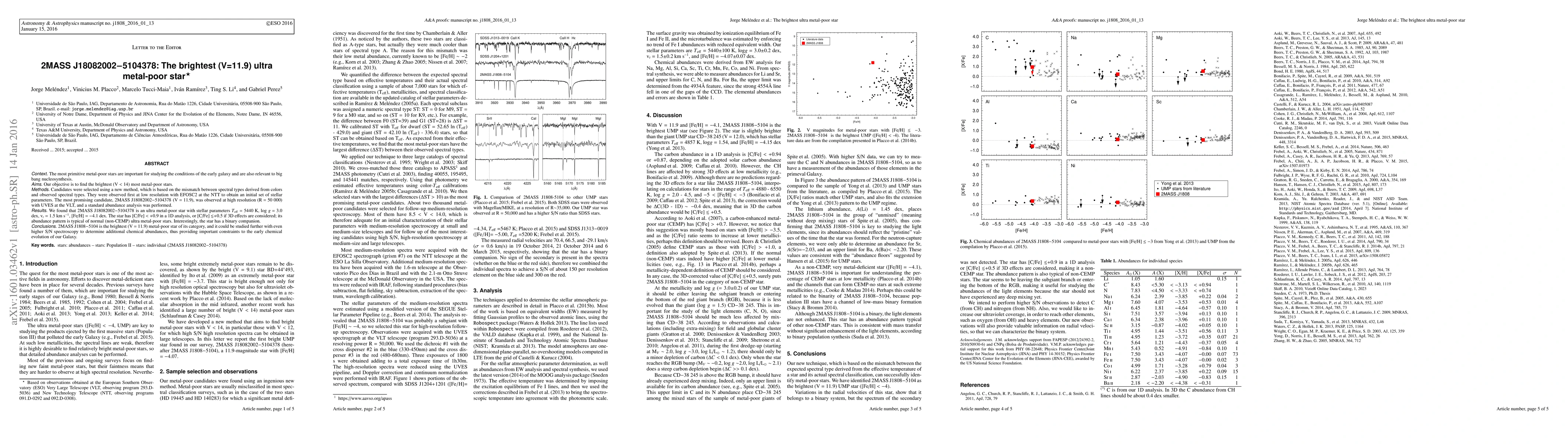 Context. The most primitive metal-poor stars are important for studying the conditions of the early galaxy and are also relevant to big bang nucleosynthesis. Aims. Our objective is to find the brightest (V<14) most metal-poor stars. Methods. Candidates were selected using a new method, which is based on the mismatch between spectral types derived from colors and observed spectral types. They were observed first at low resolution with EFOSC2 at the NTT/ESO to obtain an initial set of stellar parameters. The most promising candidate, 2MASS J18082002-5104378 (V=11.9), was observed at high resolution (R=50 000) with UVES at the VLT/ESO, and a standard abundance analysis was performed. Results. We found that 2MASS J18082002-5104378 is an ultra metal-poor star with stellar parameters Teff = 5440 K, log g = 3.0 dex, vt = 1.5 km/s, [Fe/H] = -4.1 dex. The star has [C/Fe]<+0.9 in a 1D analysis, or [C/Fe]<=+0.5 if 3D effects are considered; its abundance pattern is typical of normal (non-CEMP) ultra metal-poor stars. Interestingly, the star has a binary companion. Conclusions. 2MASS J1808-5104 is the brightest (V=11.9) metal-poor star of its category, and it could be studied further with even higher S/N spectroscopy to determine additional chemical abundances, thus providing important constraints to the early chemical evolution of our Galaxy.