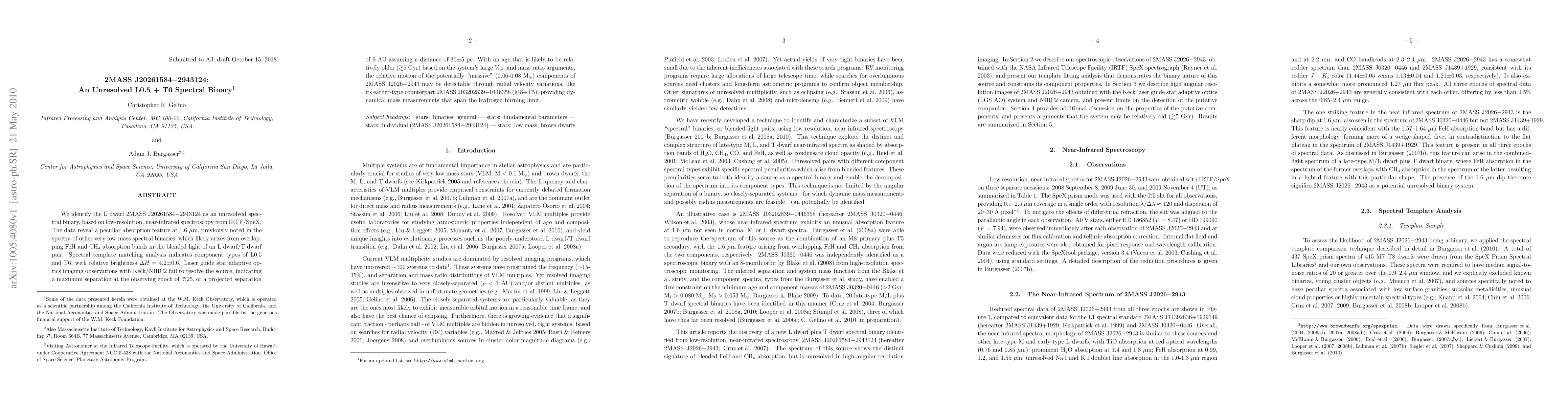 We identify the L dwarf 2MASS J20261584-2943124 as an unresolved spectral binary, based on low-resolution, near-infrared spectroscopy from IRTF/SpeX. The data reveal a peculiar absorption feature at 1.6 microns, previously noted in the spectra of other very low-mass spectral binaries, which likely arises from overlapping FeH and CH4 absorption bands in the blended light of an L dwarf/T dwarf pair. Spectral template matching analysis indicates component types of L0.5 and T6, with relative brightness Delta H = 4.2+/-0.6. Laser guide star adaptive optics imaging observations with Keck/NIRC2 fail to resolve the source, indicating a maximum separation at the observing epoch of 0.25 arcsec, or a projected separation of 9 AU assuming a distance of 36+/-5 pc. With an age that is likely to be relatively older (>5 Gyr based on the system's large vtan and mass ratio arguments, the relative motion of the potentially "massive" (0.06-0.08 Msun) components of 2MASS J2026-2943 may be detectable through radial velocity variations, like its earlier-type counterpart 2MASS J03202839-0446358 (M8+T5), providing dynamical mass measurements that span the hydrogen burning limit.
