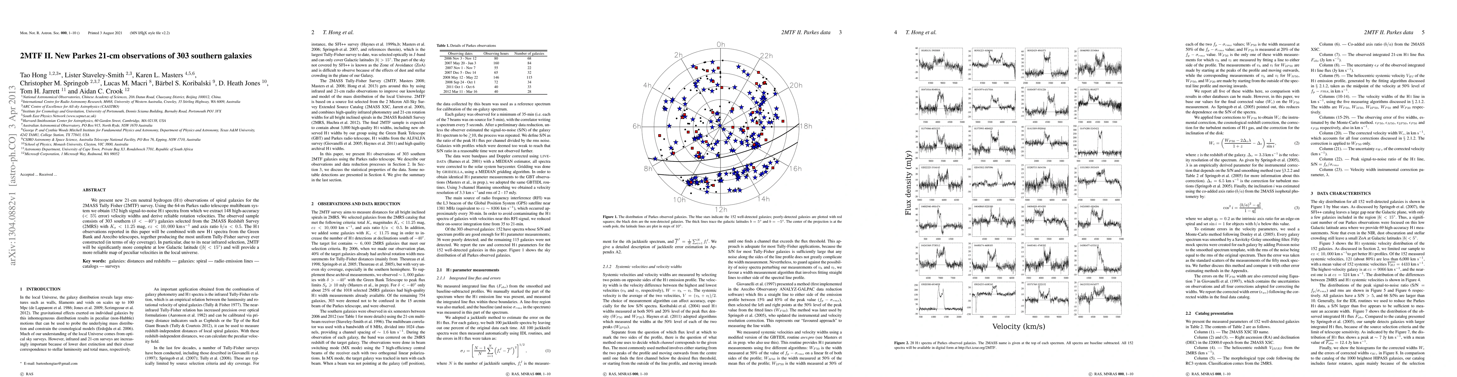 This paper reports new 21-cm HI observations of 303 southern spiral galaxies from the 2MTF survey, using the Parkes radio telescope. The study aims to construct a uniform Tully-Fisher survey, providing a more complete and reliable map of peculiar velocities in the local universe.