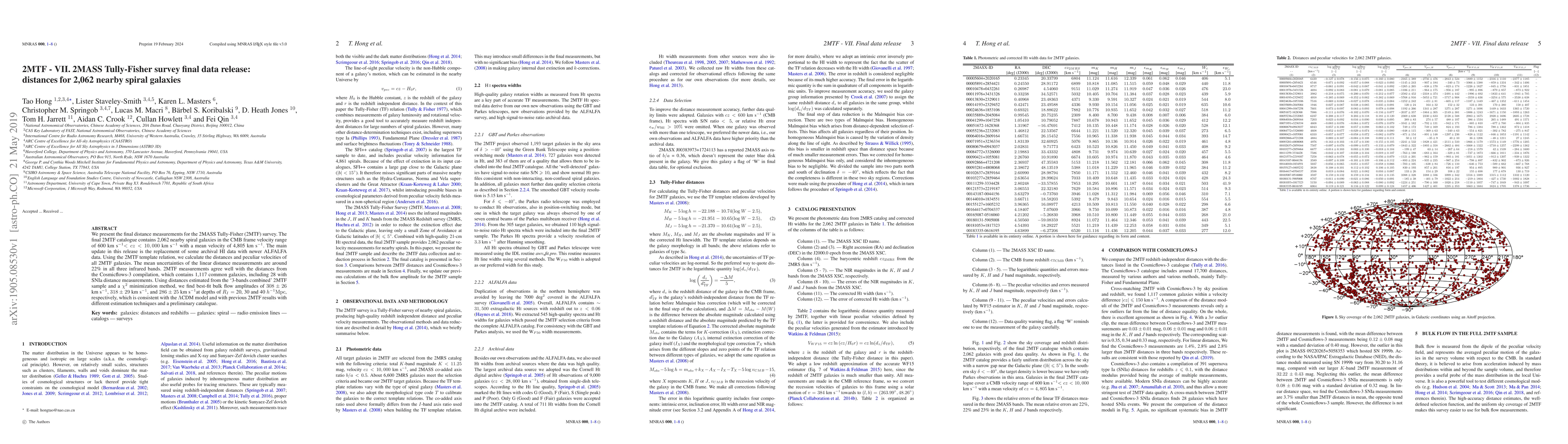 We present the final distance measurements for the 2MASS Tully-Fisher (2MTF) survey. The final 2MTF catalogue contains 2,062 nearby spiral galaxies in the CMB frame velocity range of 600 km s$^{-1}$ $< cz < 10,000$ km s$^{-1}$ with a mean velocity of 4,805 km s$^{-1}$. The main update in this release is the replacement of some archival HI data with newer ALFALFA data. Using the 2MTF template relation, we calculate the distances and peculiar velocities of all 2MTF galaxies. The mean uncertainties of the linear distance measurements are around 22\% in all three infrared bands. 2MTF measurements agree well with the distances from the Cosmicflows-3 compilation, which contains 1,117 common galaxies, including 28 with SNIa distance measurements. Using distances estimated from the `3-bands combined' 2MTF sample and a $\chi^2$ minimization method, we find best-fit bulk flow amplitudes of $308 \pm 26$ km s$^{-1}$, $318 \pm 29$ km s$^{-1}$, and $286 \pm 25$ km s$^{-1}$ at depths of $R_I = $ 20, 30 and 40 $h^{-1}{\rm Mpc}$, respectively, which is consistent with the $\Lambda$CDM model and with previous 2MTF results with different estimation techniques and a preliminary catalogue.