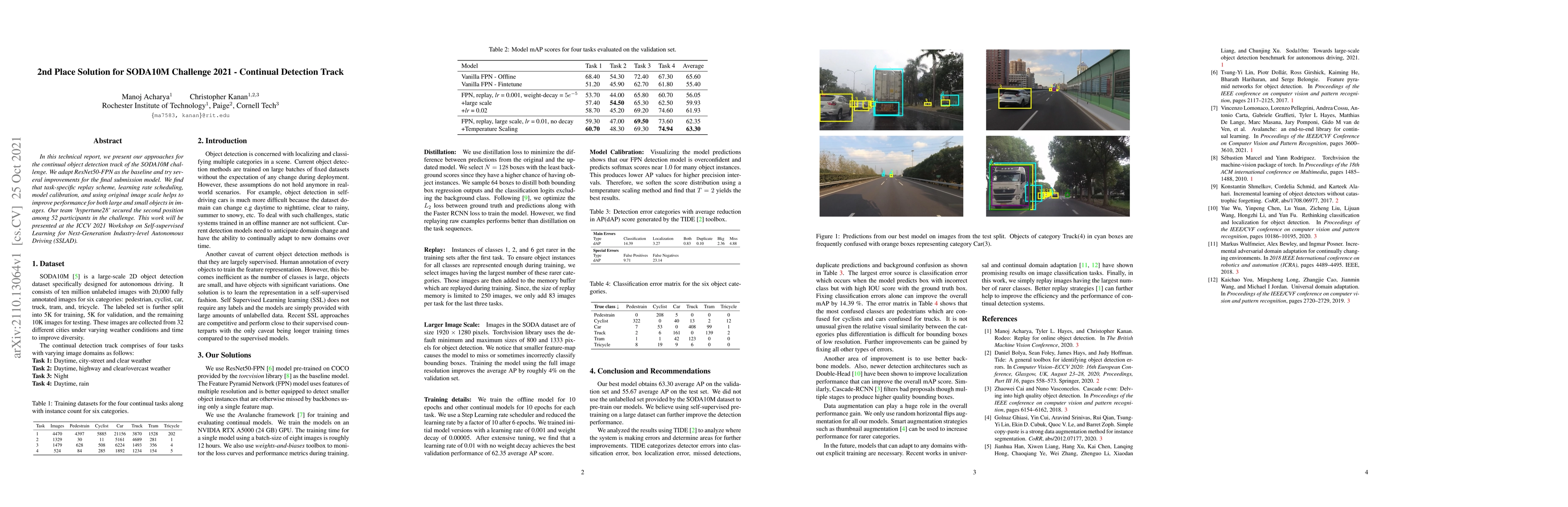 This paper details the second-place solution for the SODA10M Challenge's continual object detection track, using an adapted ResNet50-FPN model. Key improvements include task-specific replay, learning rate scheduling, model calibration, and maintaining original image scale, which enhanced performance for both large and small objects.